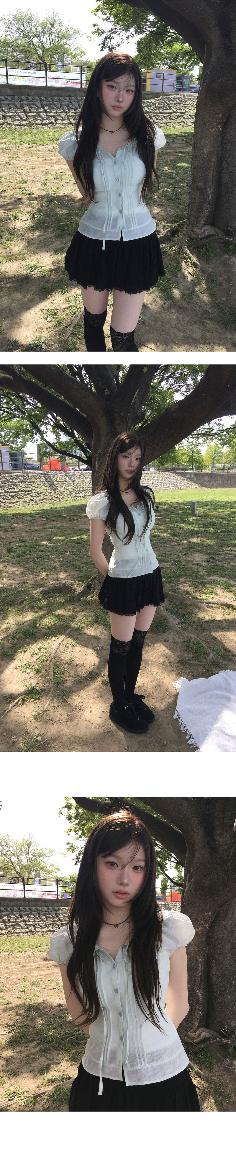 chic 한국 스타일 프릴 반팔 싱글 줄 버튼 페이크 레이어드 셔츠