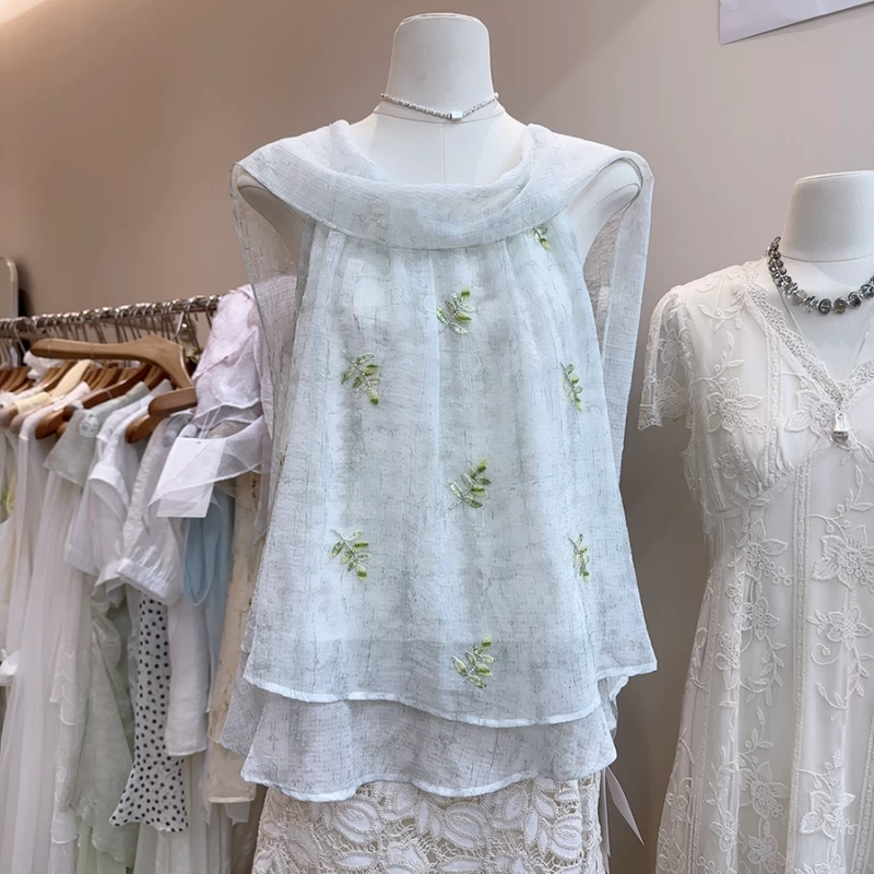 경관 그림 안개 염색 꽃 와일드 자수 민소매 슬립 맨위 비즈 핀치 Pleat 한 마디 루즈핏 한 부서 작은 셔츠 여름 26