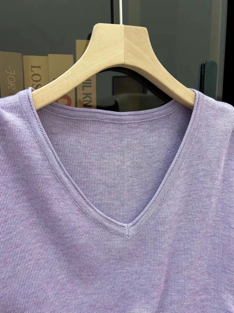 보라색 순수한 욕망 V넥 니트 얼음 실크 작은 날다 소매 긍정적 인 어깨 티셔츠 작은 키 몸매 가꾸기 불규칙 쇼트 스타일 맨위 여성 여름