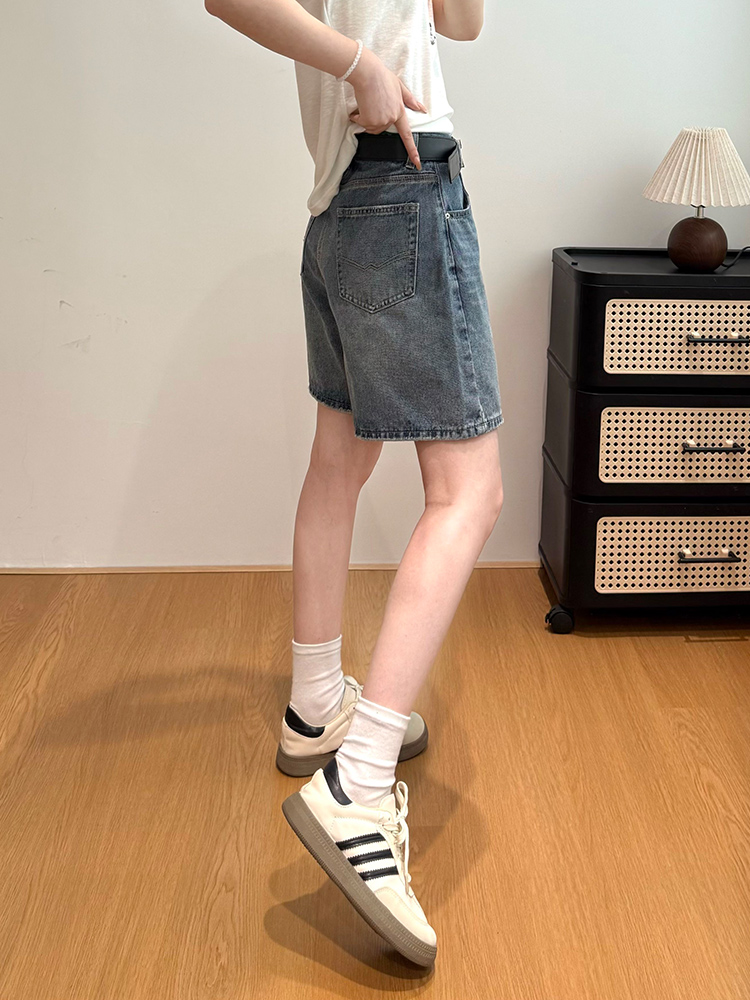 실사 레트로 파란색 4 점 청바지 여성 여름 하이웨이스트 슬림해 보이는 넓은 다리 루즈핏 다용도 핫 바지 반바지