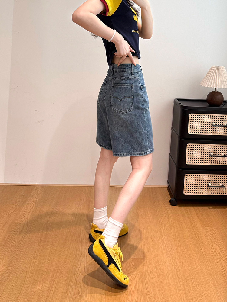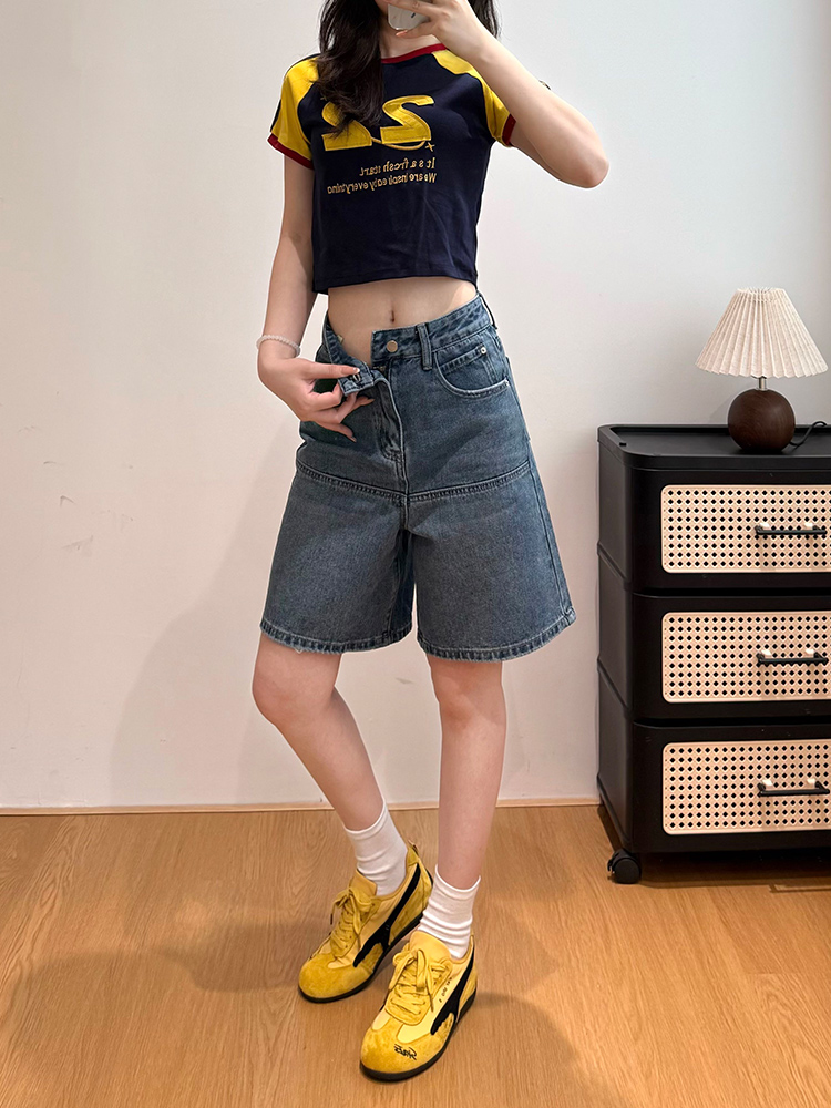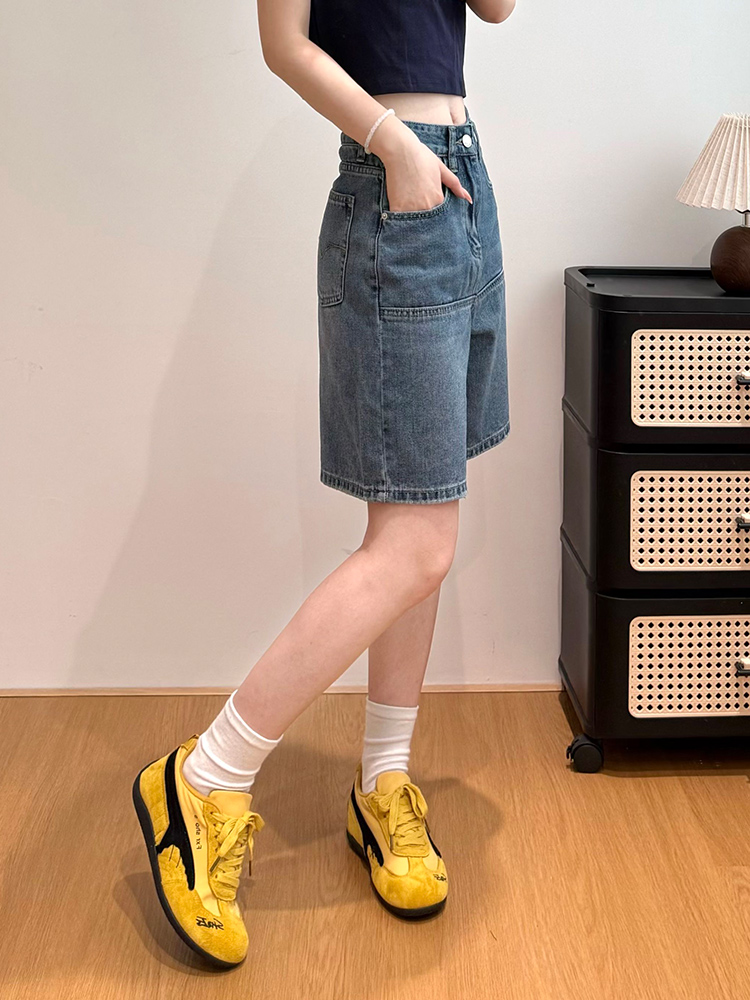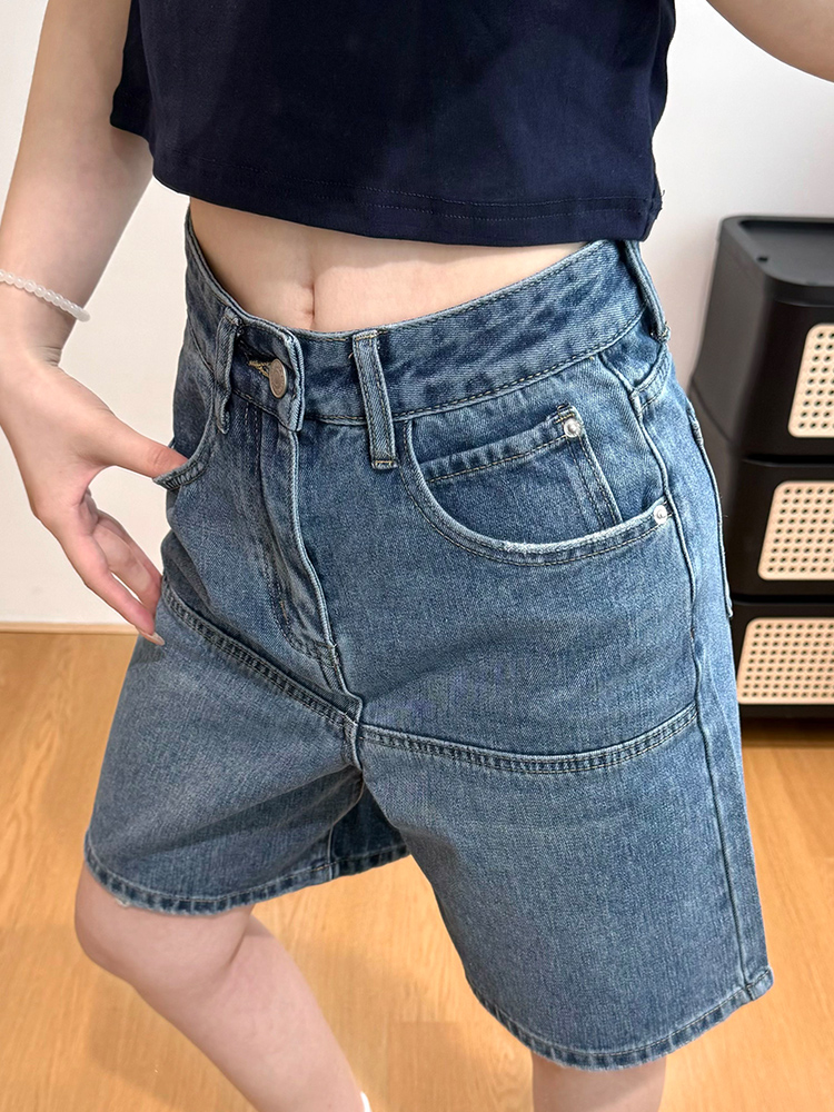 실사 레트로 파란색 4 점 청바지 여성 여름 하이웨이스트 슬림해 보이는 넓은 다리 루즈핏 다용도 핫 바지 반바지