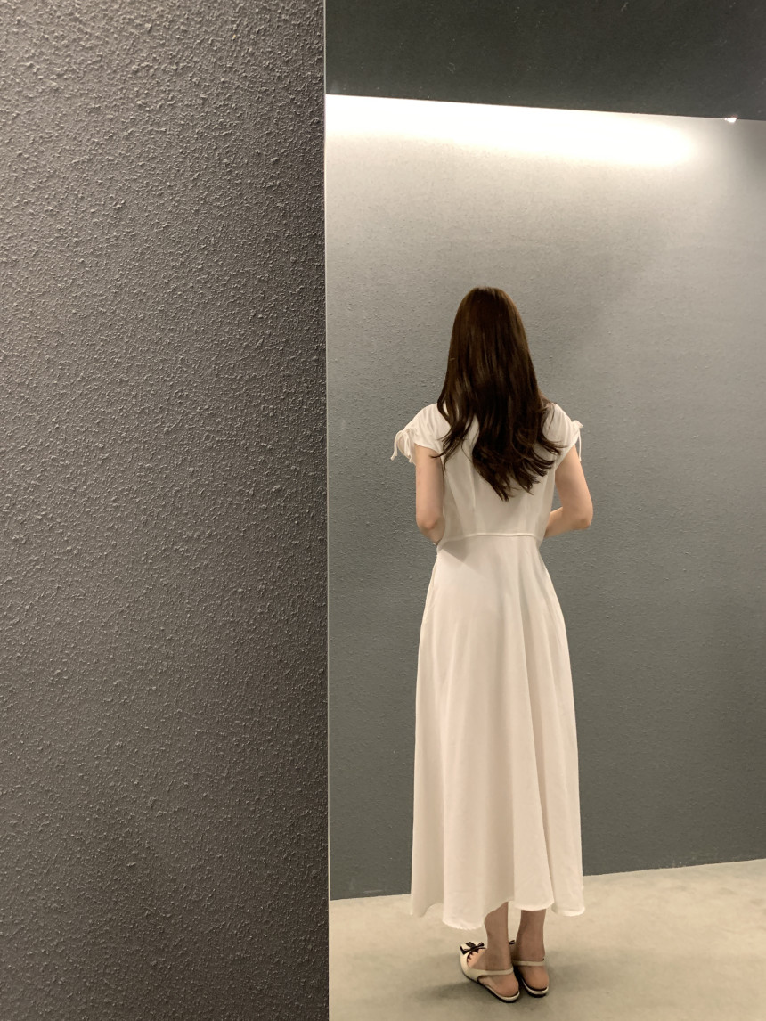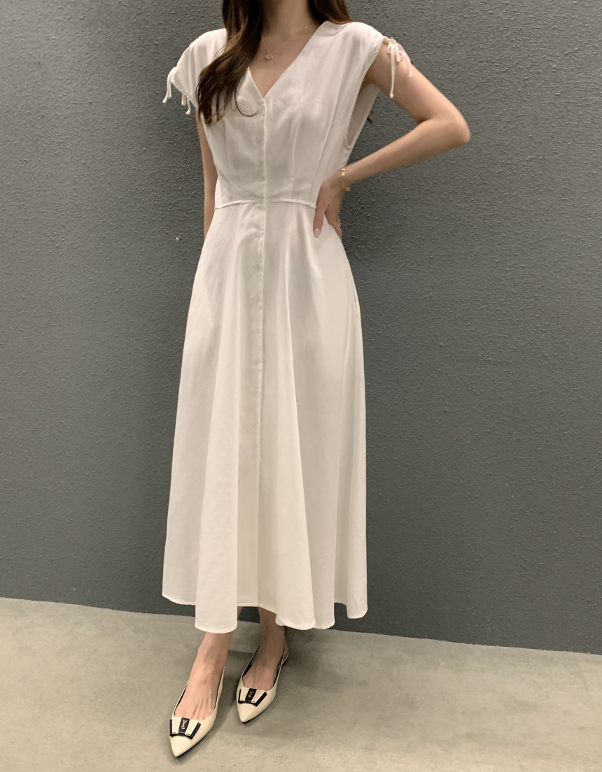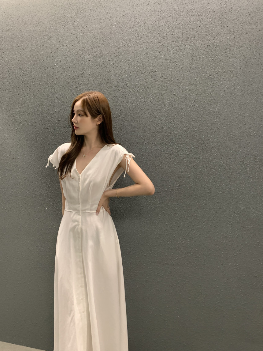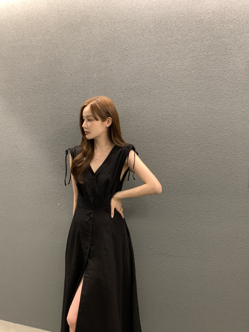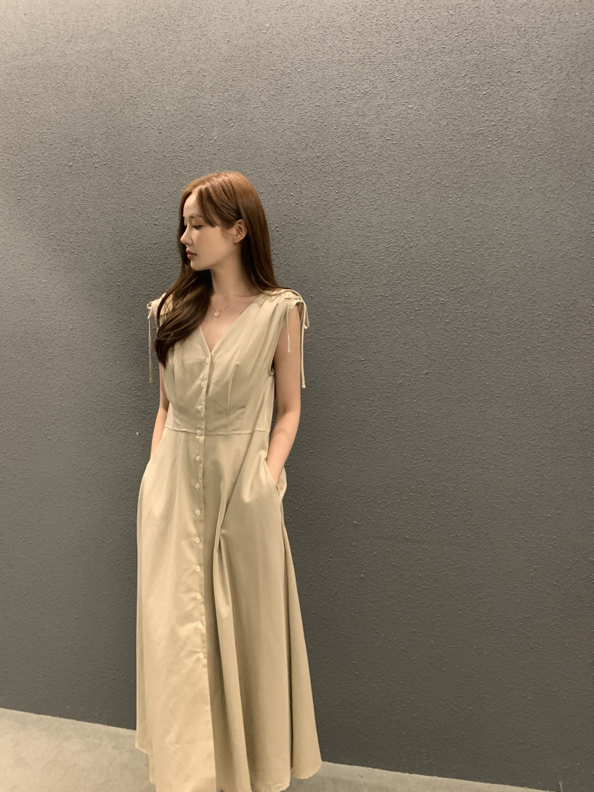 한국 chic 프랑스식 품격 V넥 펌프 로프 싱글 줄 버튼 민소매 드레스