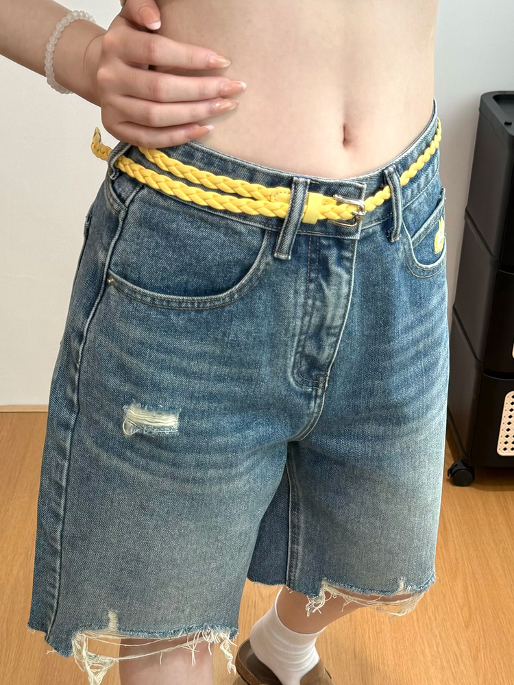 실사 2026 여름 기울이기 압력 라인 워싱 레트로 노스탤지어 색상 찢어진 데님 7부 바지 트렌디