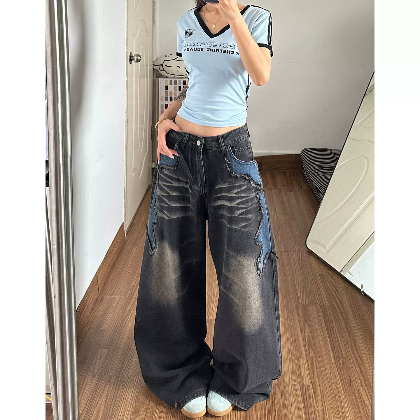 아메리칸 레트로 배색 패치워크 패치 청바지 바지 여자 새로운 루즈핏 스트레이트 작은 대중 와이드 레그 팬츠 y2k