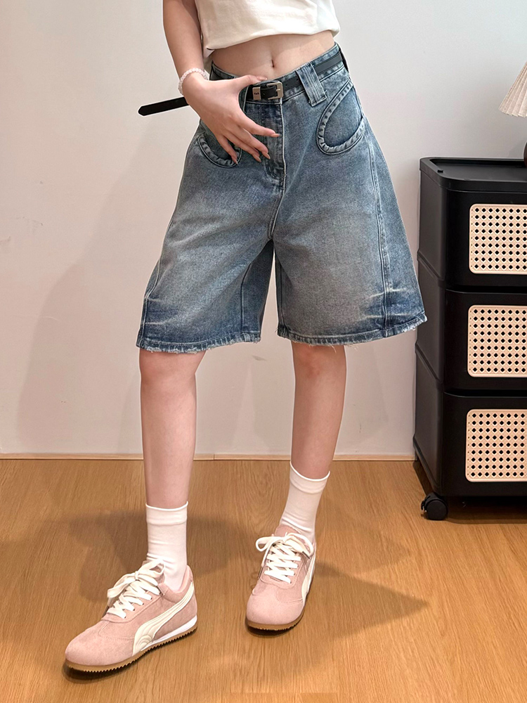 실사 레트로 파란색 4 점 청바지 여성 여름 하이웨이스트 슬림해 보이는 넓은 다리 루즈핏 다용도 핫 바지 반바지