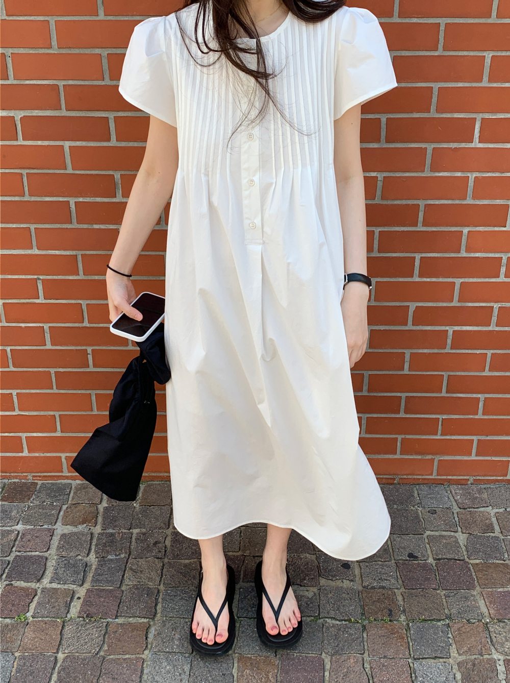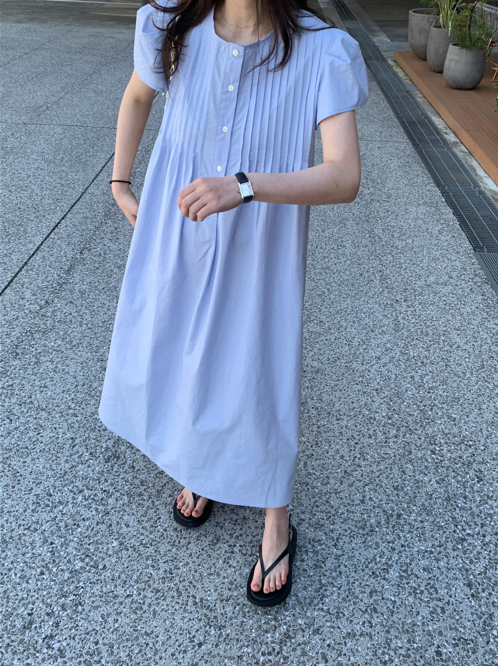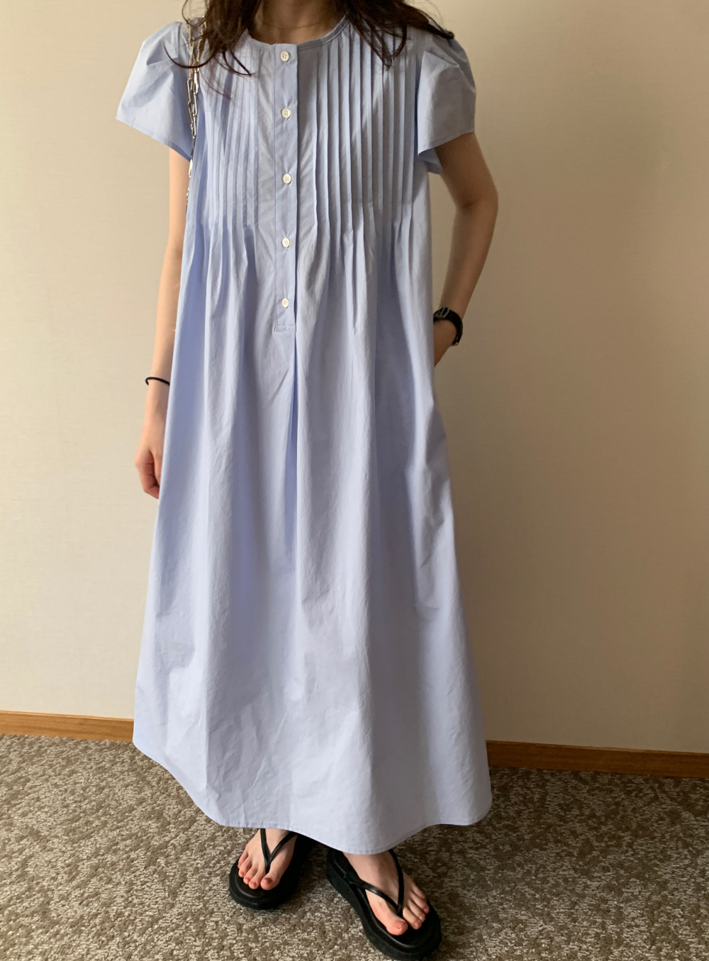 여름 얇은 스타일 스트레이트 루즈핏 표지 고기 순면 프랑스식 거품 소매 플리츠 라운드 넥 드레스