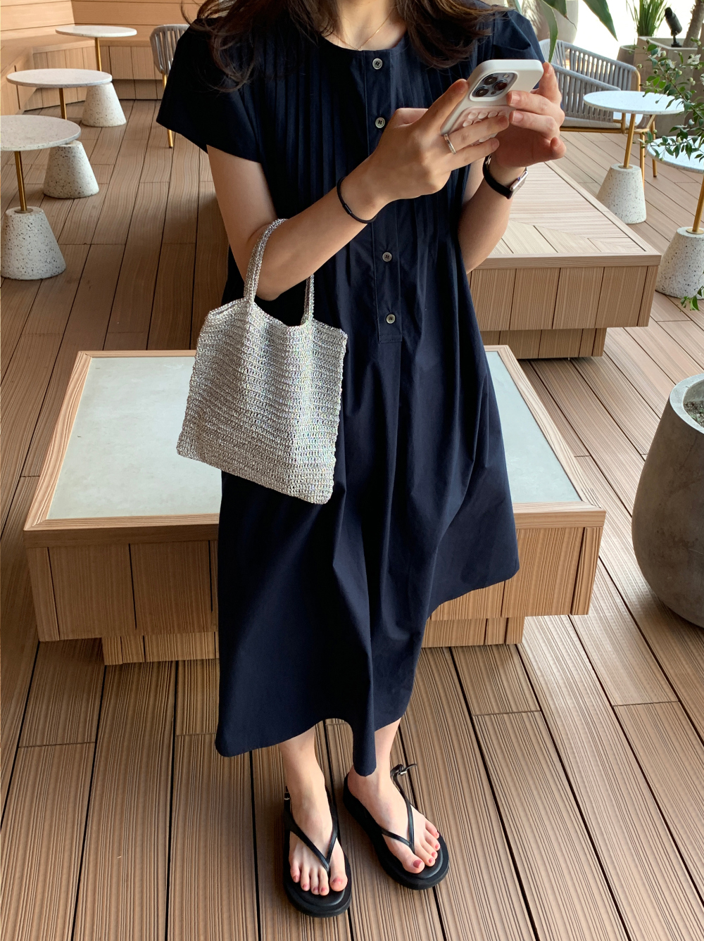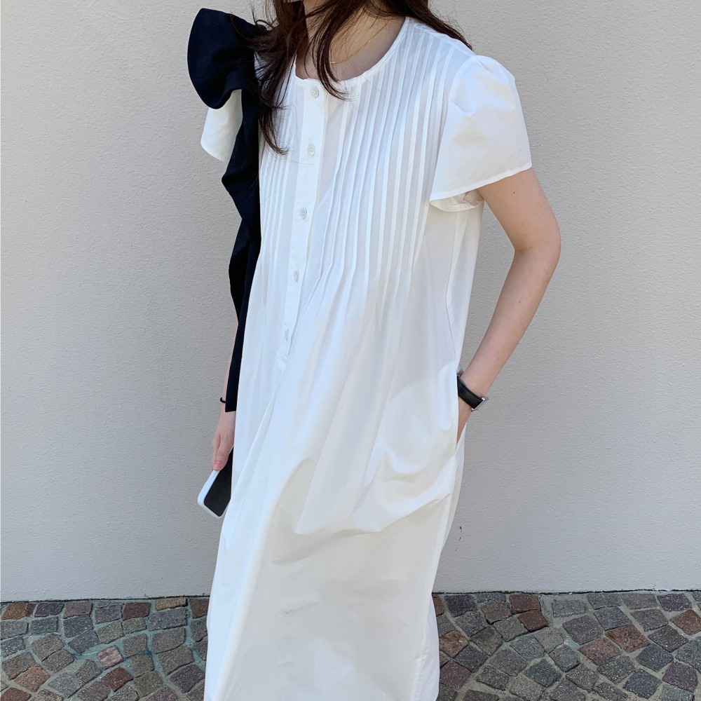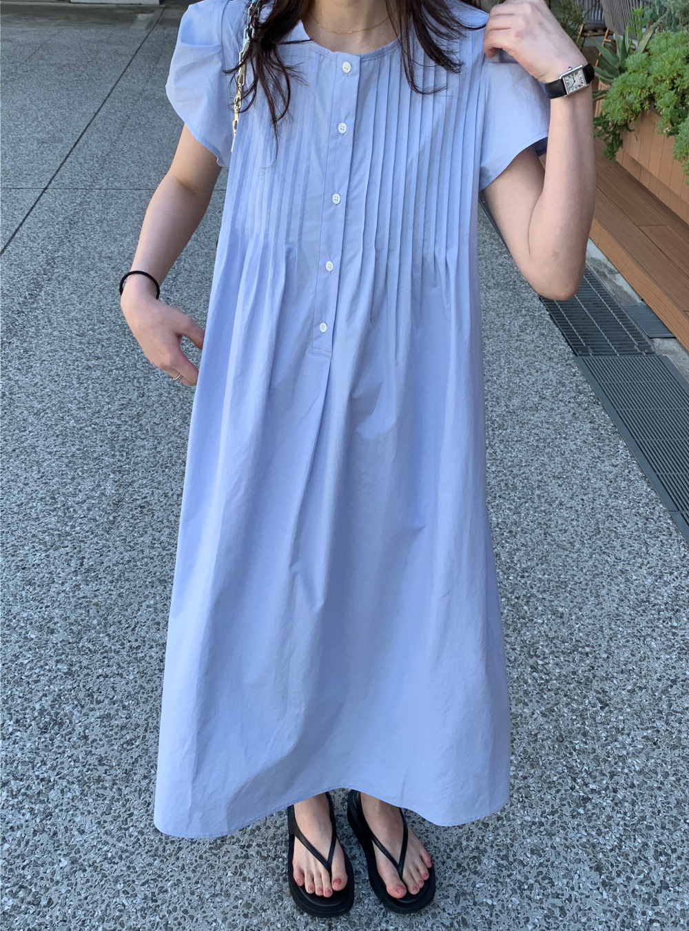 여름 얇은 스타일 스트레이트 루즈핏 표지 고기 순면 프랑스식 거품 소매 플리츠 라운드 넥 드레스