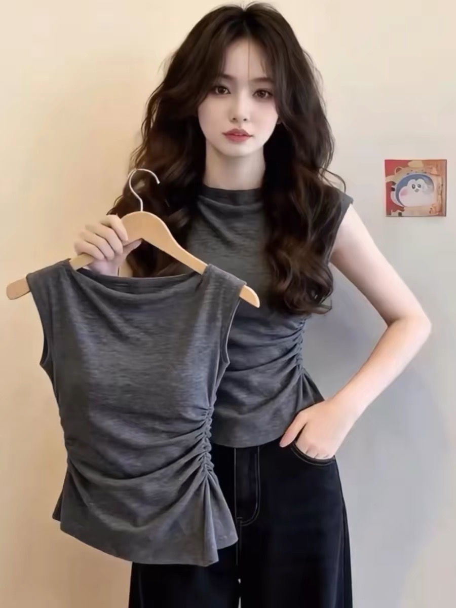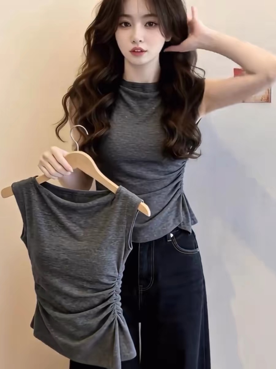 회색 주름 허리 수축 민소매 티셔츠 여성 2026 새로운 여름 한 부서 ins 디자인 센스 맨위 마이크로 직장 착용 가져 가라.