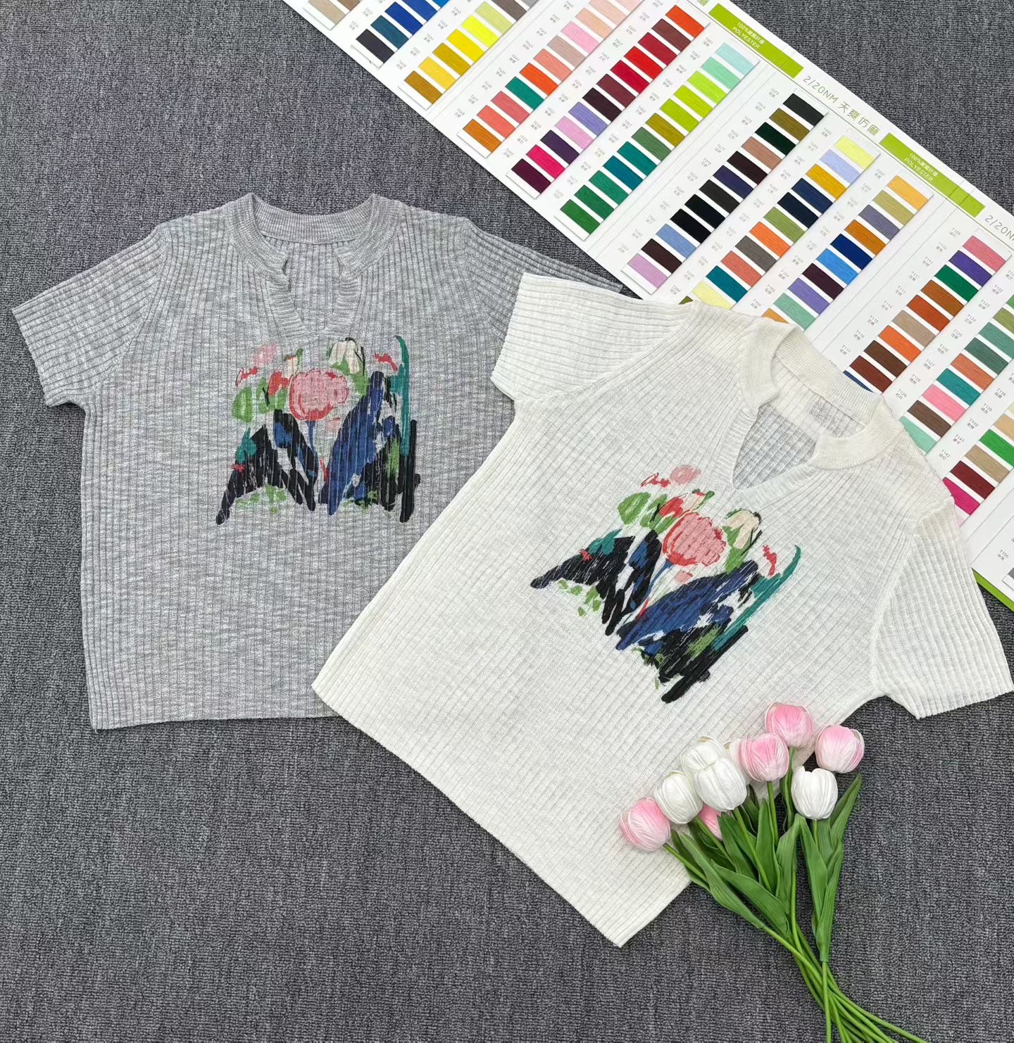 2026 여름 만화 꽃 낙서 프린트 V넥 반팔 티셔츠 여성 얇은 스타일 루즈핏 맨위