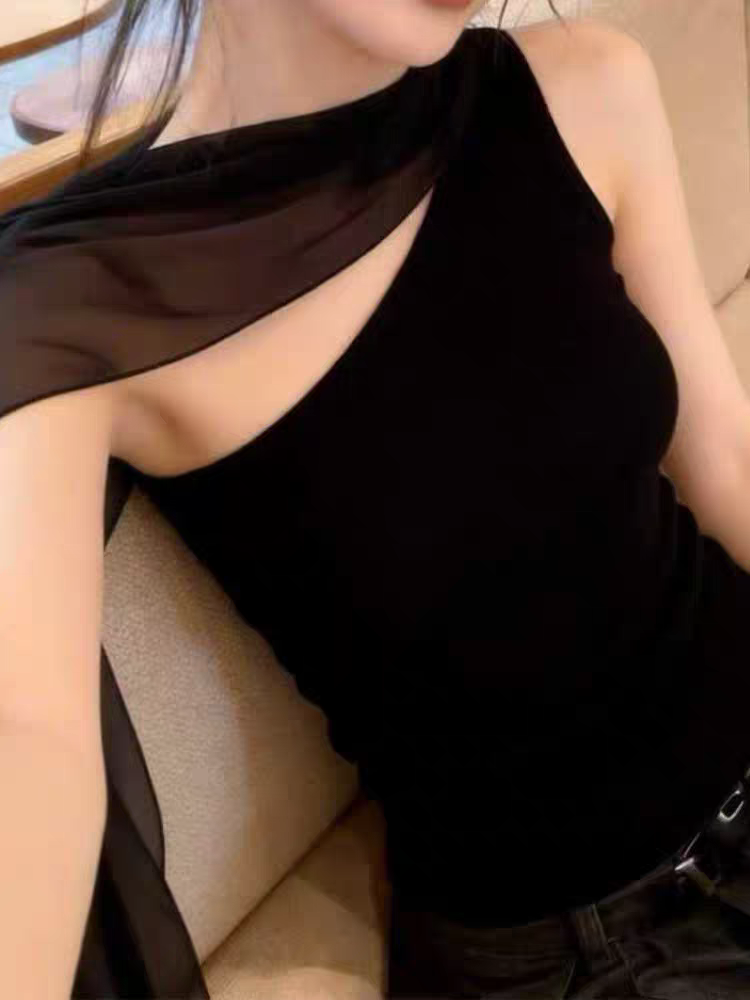 여름 순수한 욕망 다용도 망사 리본 검정색 캐미솔 디자인 센스 작은 대중 몸매 가꾸기 민소매 행침 목 맨위