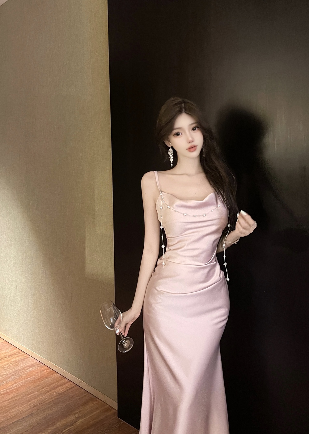 실사 명문 여성 품격 섹시함 무거운 작업 새틴 몸매 가꾸기 주름 드레스