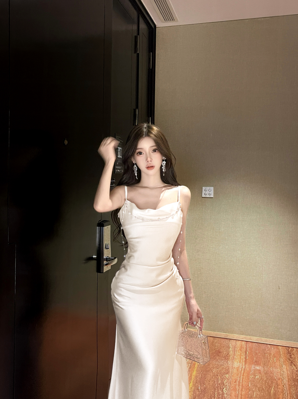 실사 디자인 센스 체인 장식 고급 센스 명문 여성 섹시함 새틴 도루 센스 슬립 드레스