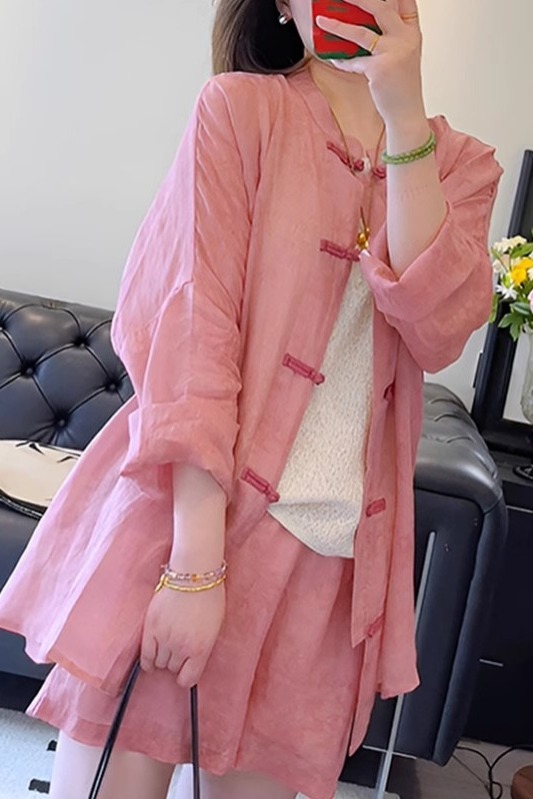 여름 드레스 새로운 빅 사이즈 여성 의류 레트로 중식 단추 루즈핏 자외선 차단 셔츠 캐주얼 느긋한 반바지 투피스 세트