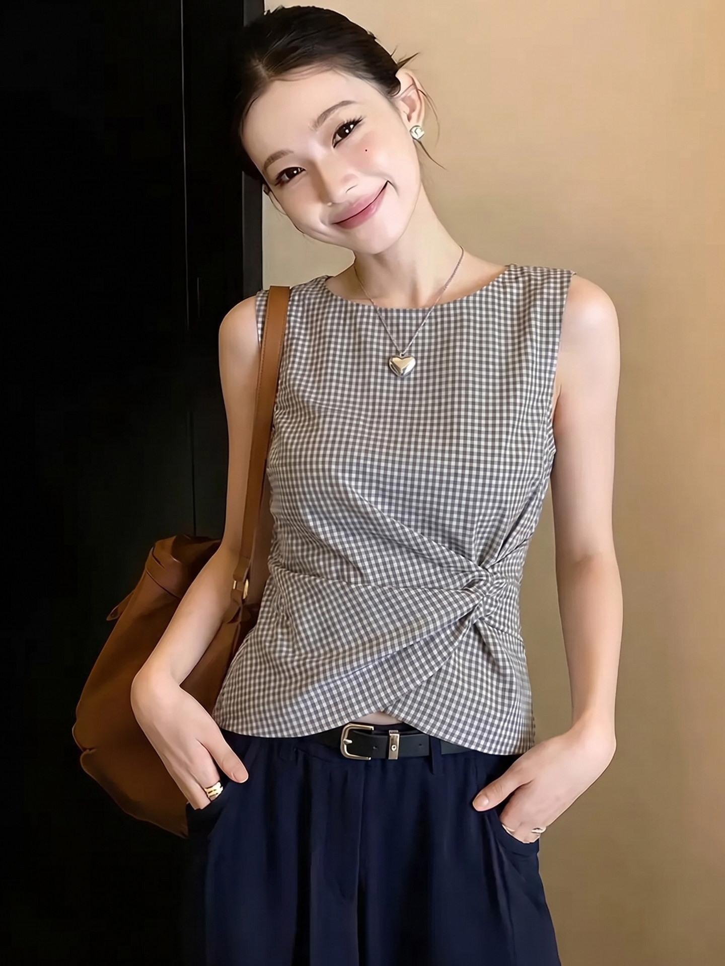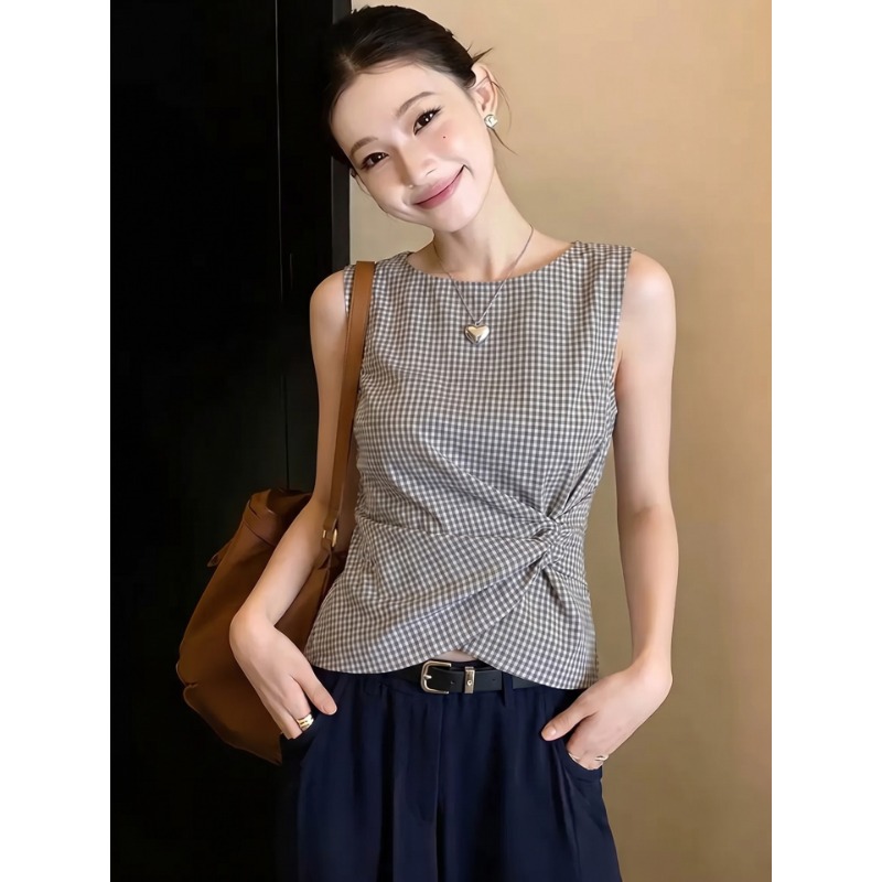 프랑스식 빛 요리 한 바람 체크무늬 민소매 조끼 여성 여름 새로운 디자인 센스 몸매 가꾸기 허리 수축 고급 센스 연령 감소 맨위