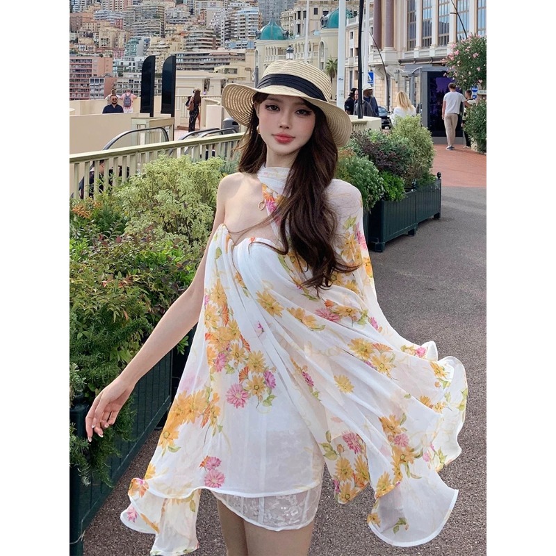 pusumede 프랑스식 V넥 꽃무늬 슬립 여성 드레스 여름 허리 수축 슬림해 보이는 질감 센스 한 마디 짧은 치마