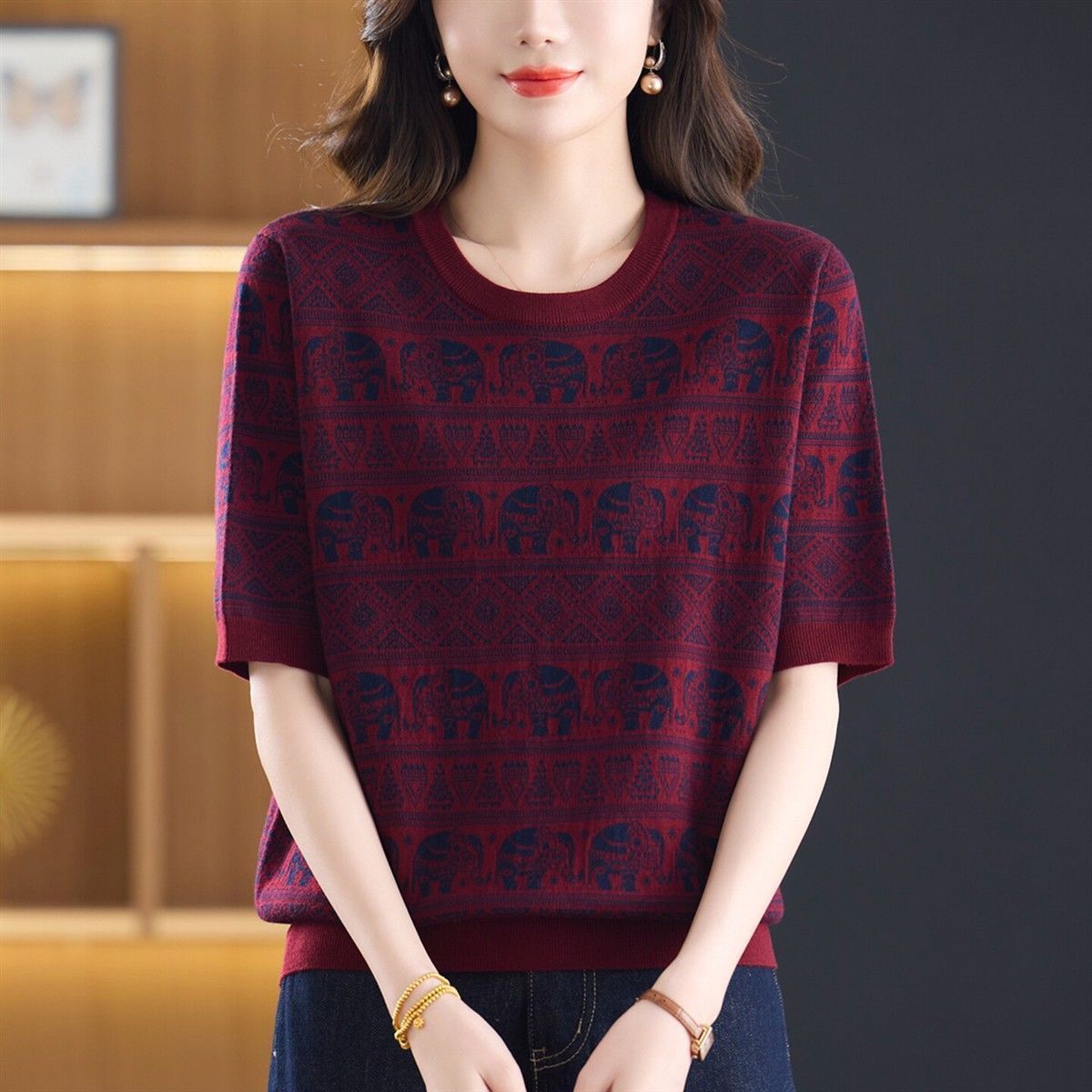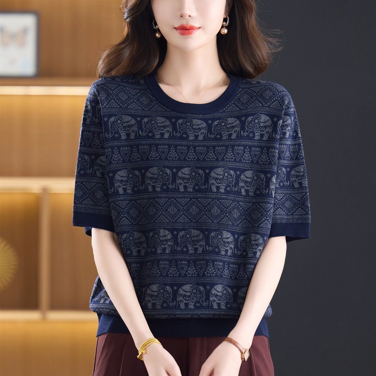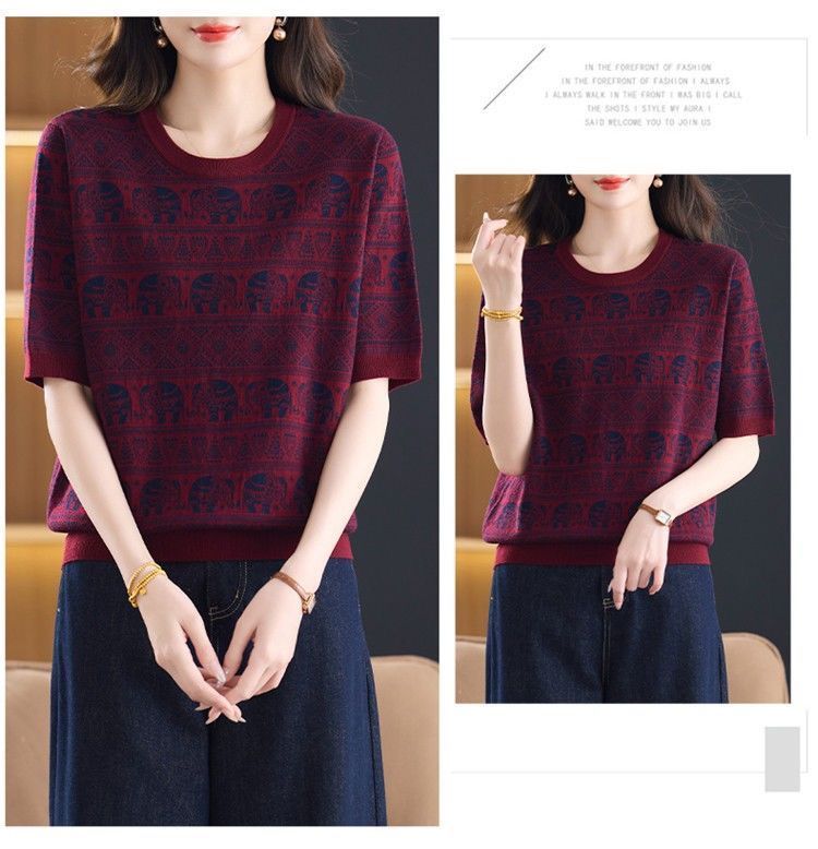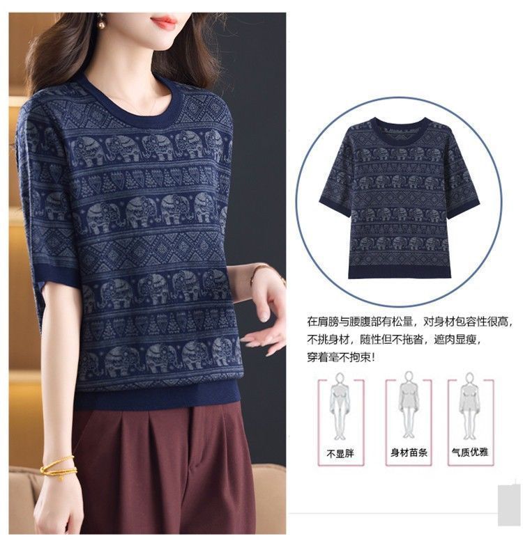 여름 새로운 고급 얼음 실크 티셔츠 여성 루즈핏 라운드 넥 맨위 패션 다용도 니트 스웨터 반팔 엄마 표지 고기