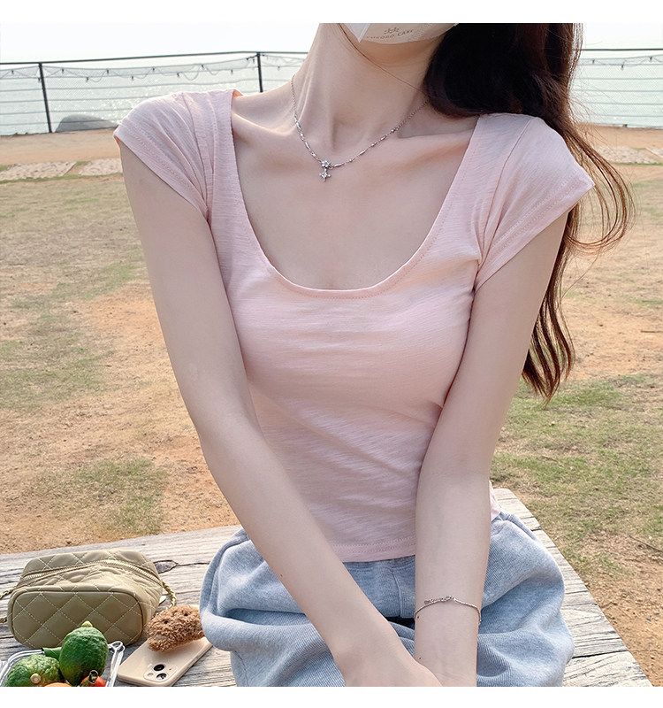 낮음 u 칼라 긍정적 인 어깨 핑크색 반팔 티셔츠 여성 여름 달콤한 매운맛 순수한 욕망 바람 외국 가스 몸매 가꾸기 슬림해 보이는 만나는 작은 셔츠 맨위