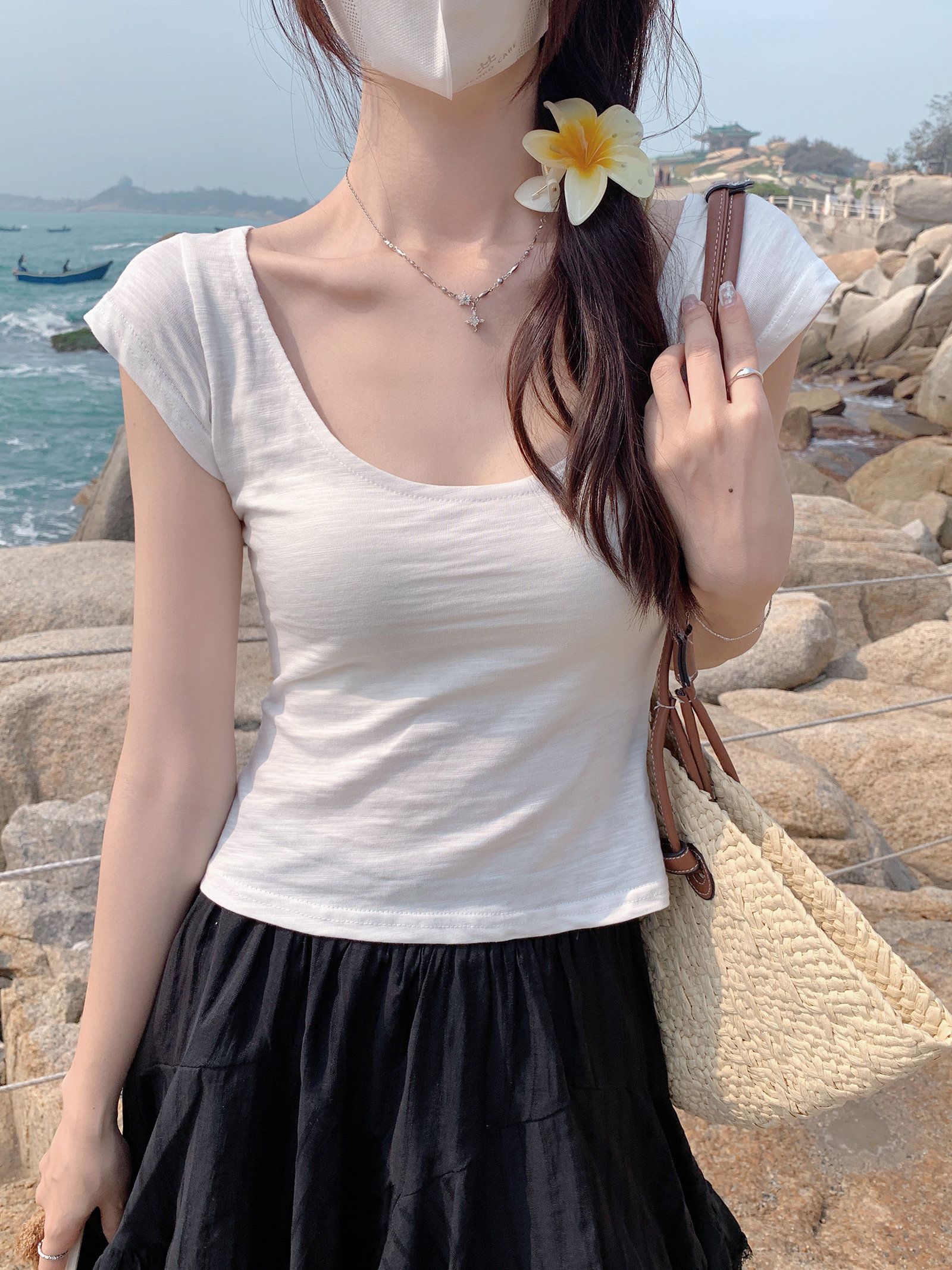 면 소재 화이트 반소매 긍정적 인 어깨 티셔츠 여성 여름 새로운 기초 섹션 작은 스탠드 칼라 반팔 맨위
