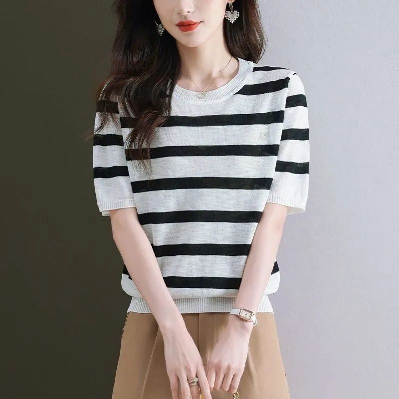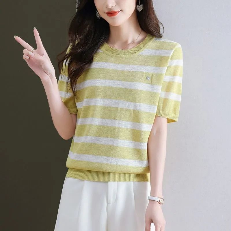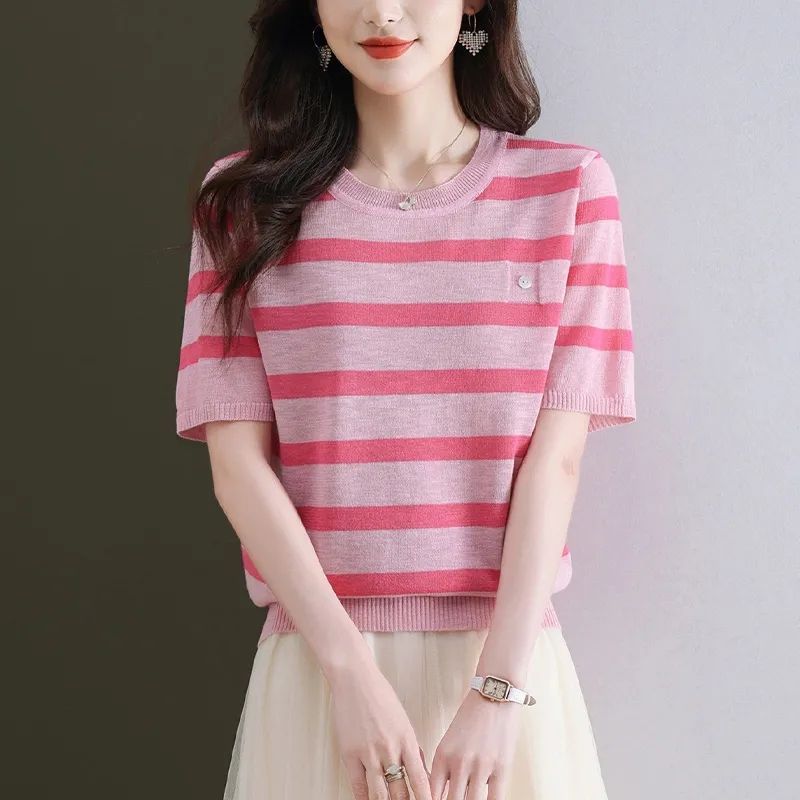 여름 새로운 라운드 넥 패션 다용도 빅 사이즈 반팔 스트라이프 품격 니트 스웨터 티셔츠 쇼트 스타일 얼음 실크 맨위 여성