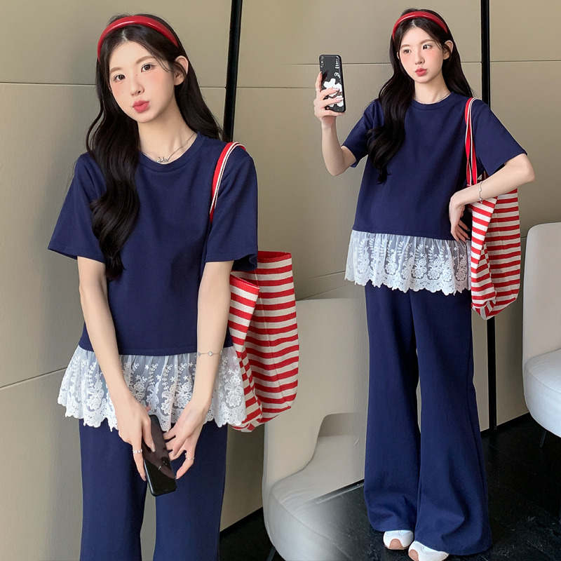 선물 실사 2026 여름 새로운 임산부 티셔츠 레이스 조각 마이크로 매운맛 와이드 레그 팬츠 바지 느긋한 루즈핏 세트