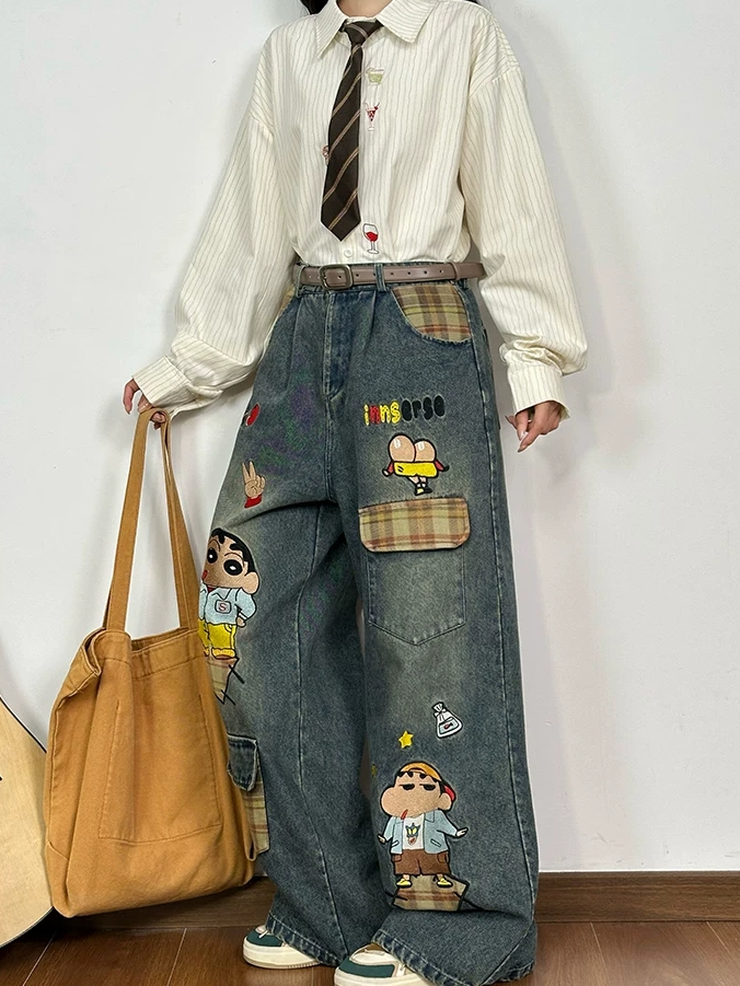 아메리칸 바람 만화 프린트 청바지 여성 새로운 재미있는 패치 자수 느긋한 바람 도루 센스 루즈핏 와이드 레그 팬츠 어린이