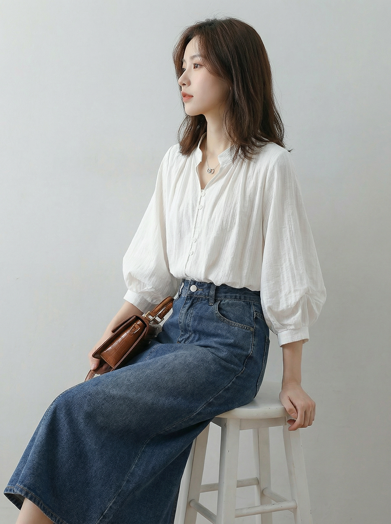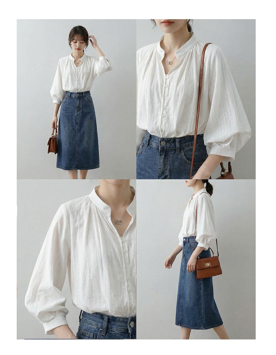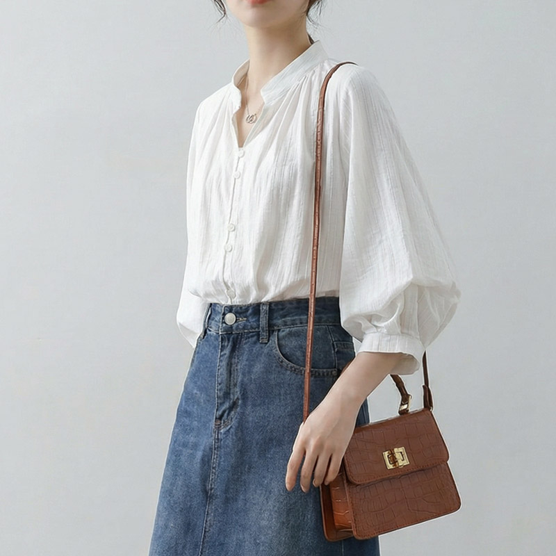 화이트 여성 셔츠 여름 5 점 소매 작은 대중 맨위 고급 센스 새틴 한국 스타일 품격 출퇴근 벌룬 소매 셔츠