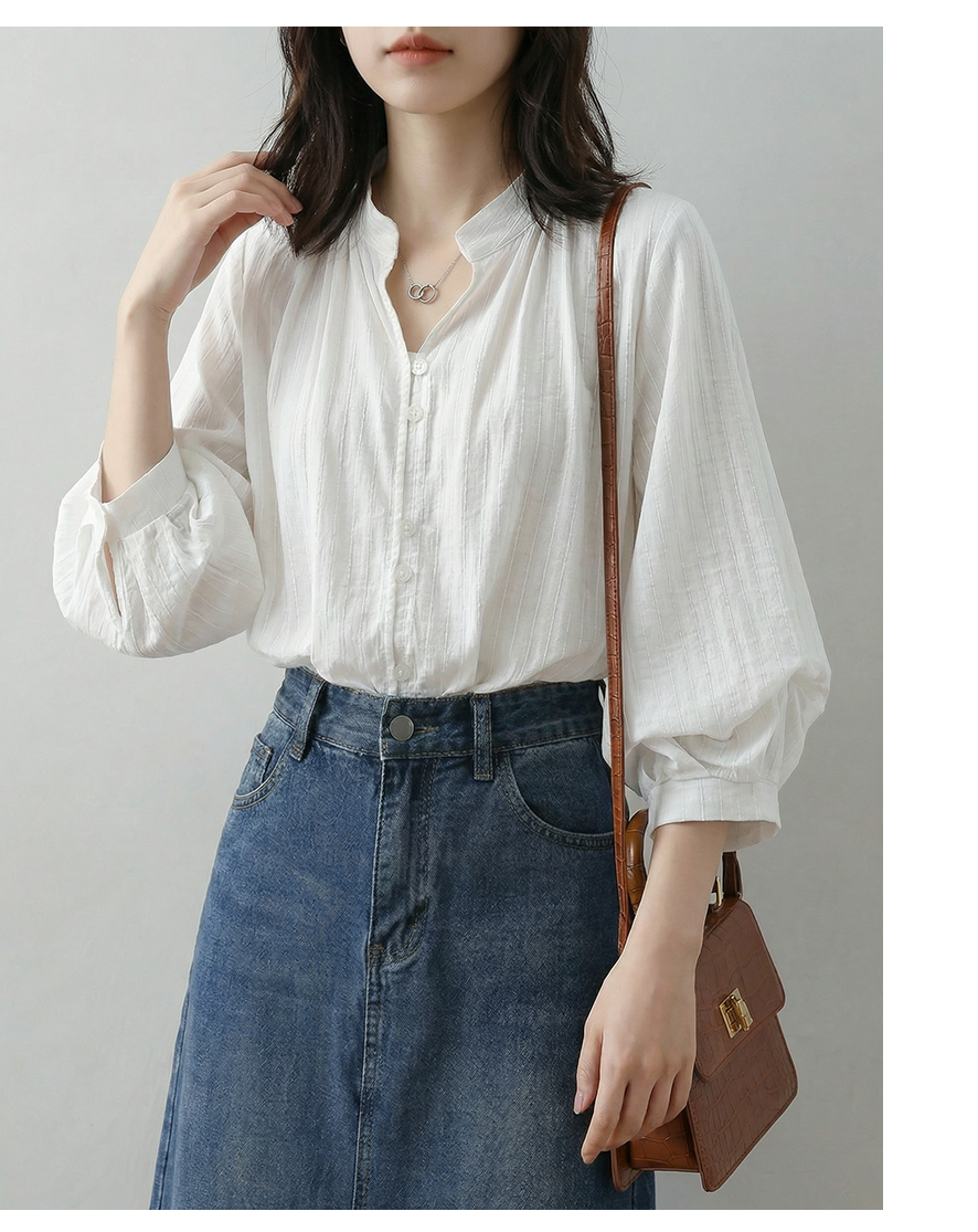 프랑스식 V넥 화이트 반팔 여성 셔츠 여름 디자인 센스 작은 대중 작은 키 벌룬 소매 5 점 소매 맨위