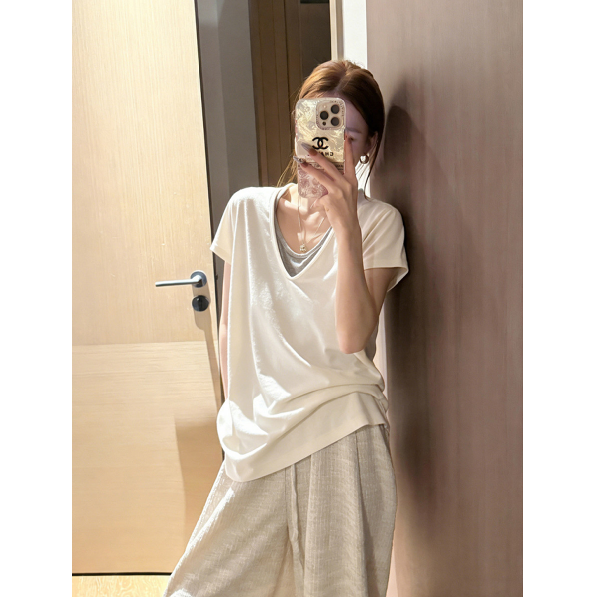 느슨함 센스 배색 페이크 레이어드 V넥 반팔 티셔츠 여성 여름 긍정적 인 어깨 슬림해 보이는 루즈핏 코치 반팔 만나는 맨위