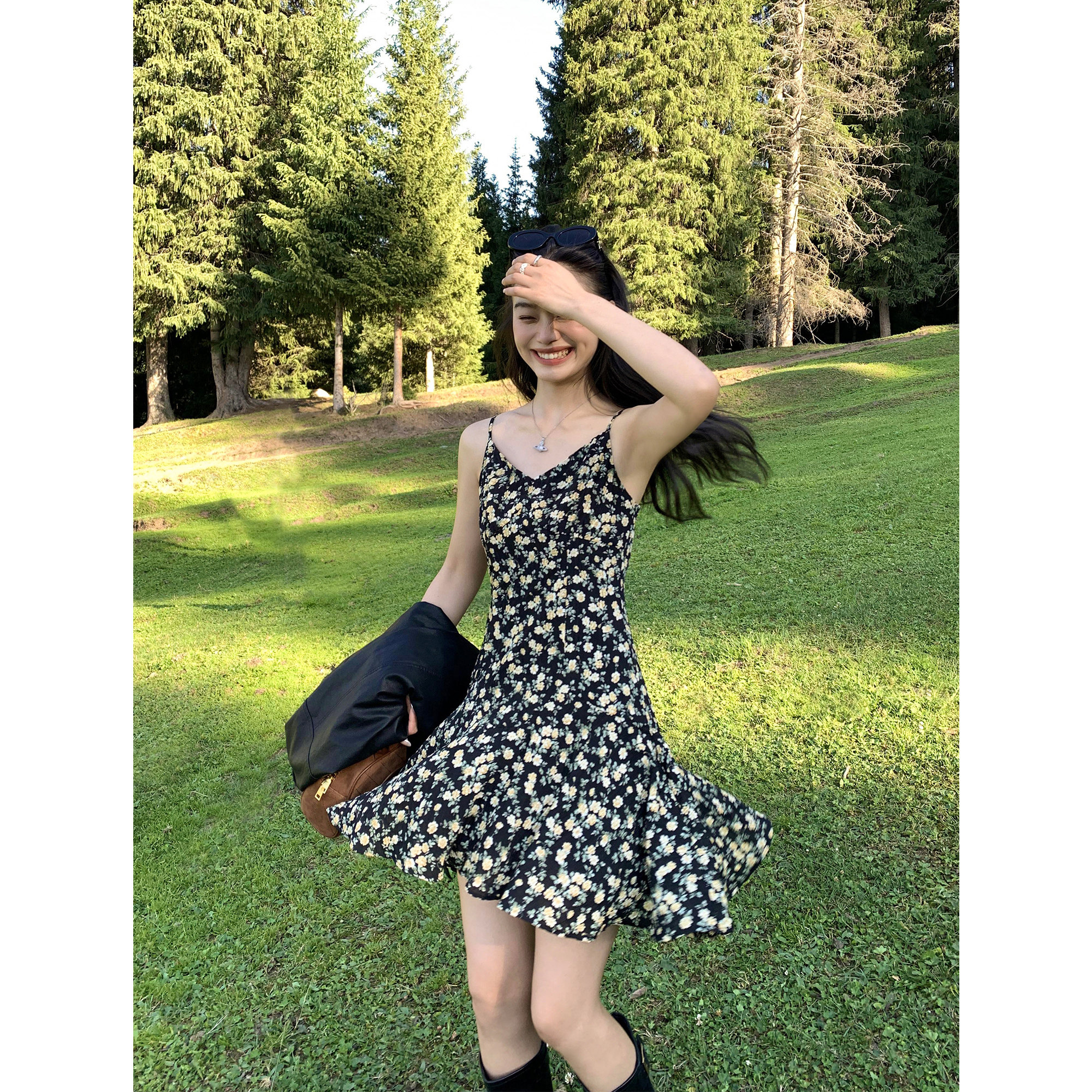 pusumede 프랑스식 V넥 꽃무늬 슬립 여성 드레스 여름 허리 수축 슬림해 보이는 질감 센스 한 마디 짧은 치마