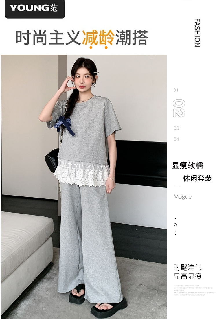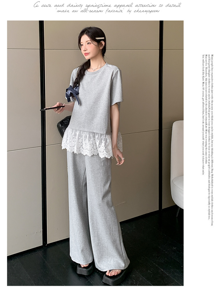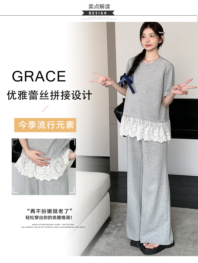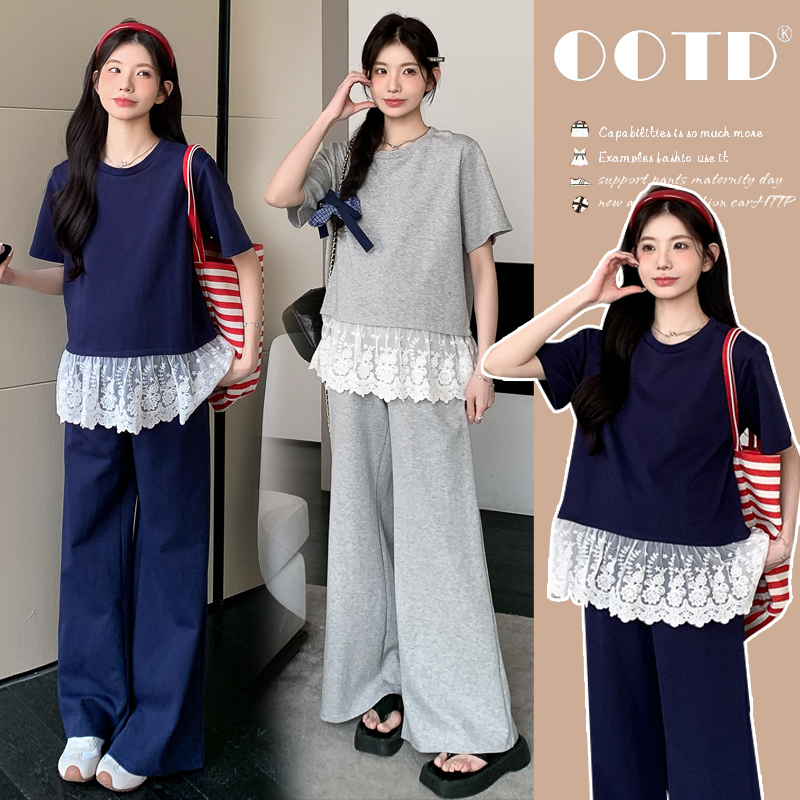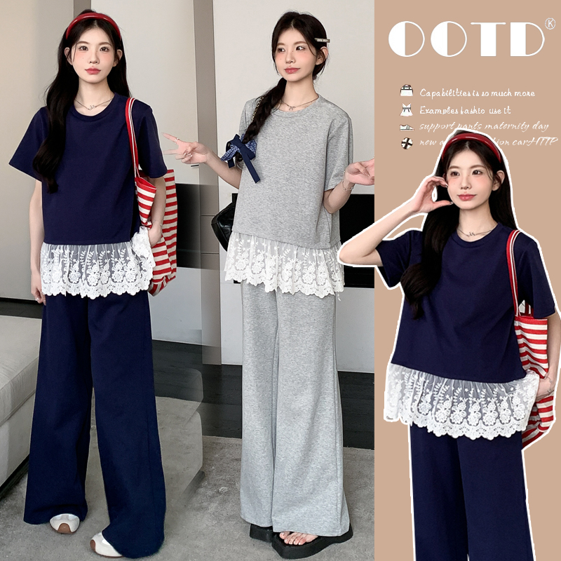 선물 실사 2026 여름 새로운 임산부 티셔츠 레이스 조각 마이크로 매운맛 와이드 레그 팬츠 바지 느긋한 루즈핏 세트