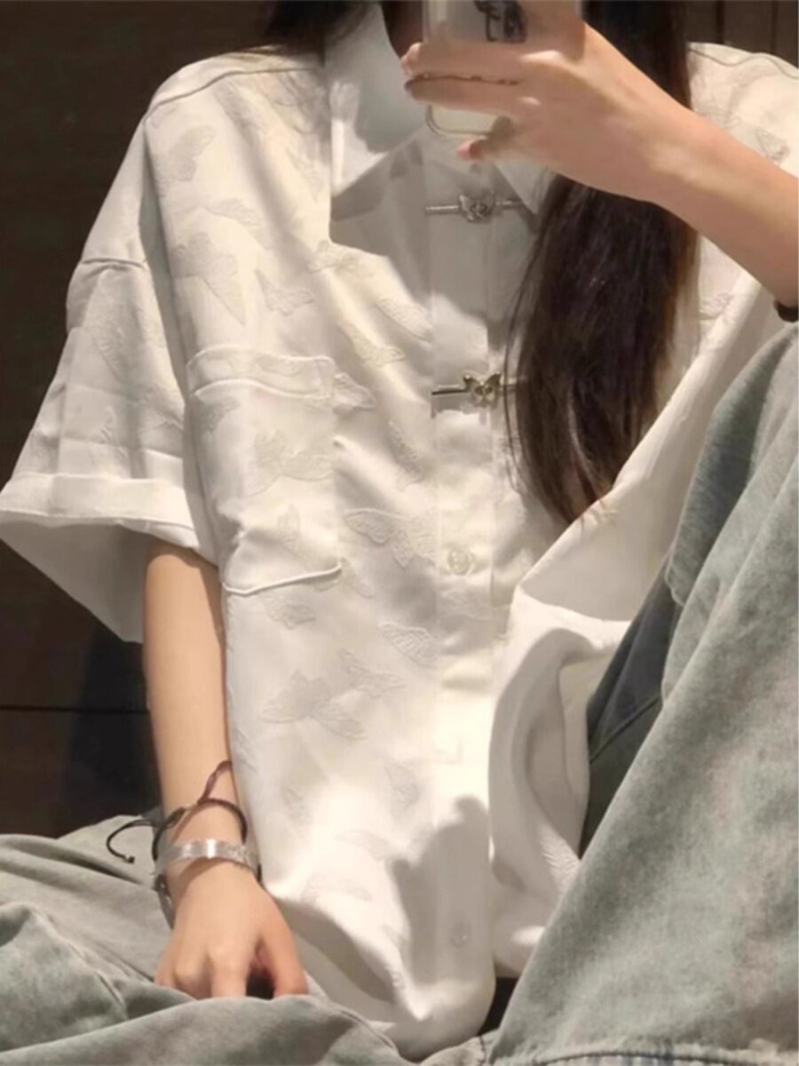 학원 스타일 새로운 중식 작은 대중 디자인 센스 반팔 여성 셔츠 여름 새로운 자카드 국풍 자수 화이트 셔츠