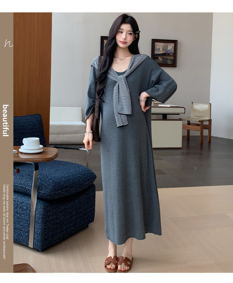 2026 여름 새로운 스트라이프 패치워크 색상 니트 드레스 임신 엄마 고급 센스 슬림해 보이는 다용도 롱 스커트