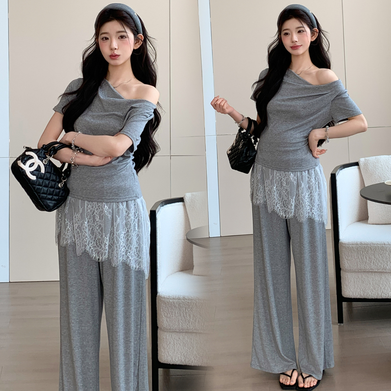 2026 여름 새로운 임산부 레이스 조각 방귀 커튼 티셔츠 와이드 레그 팬츠 느긋한 루즈핏 세트