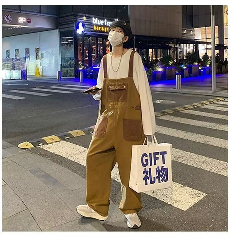 양면 워크웨어 멜빵 바지 캐주얼 워크웨어 팬츠 루즈핏 스트레이트 팬츠 와이드 레그 팬츠 슬립 낫 롱 바지