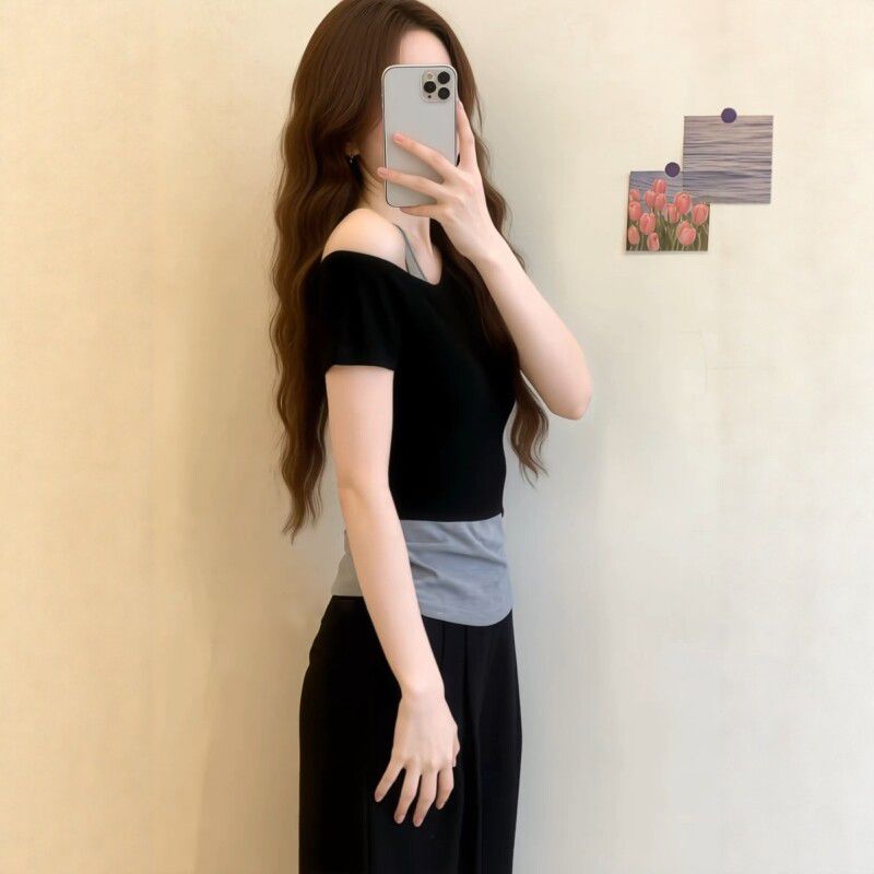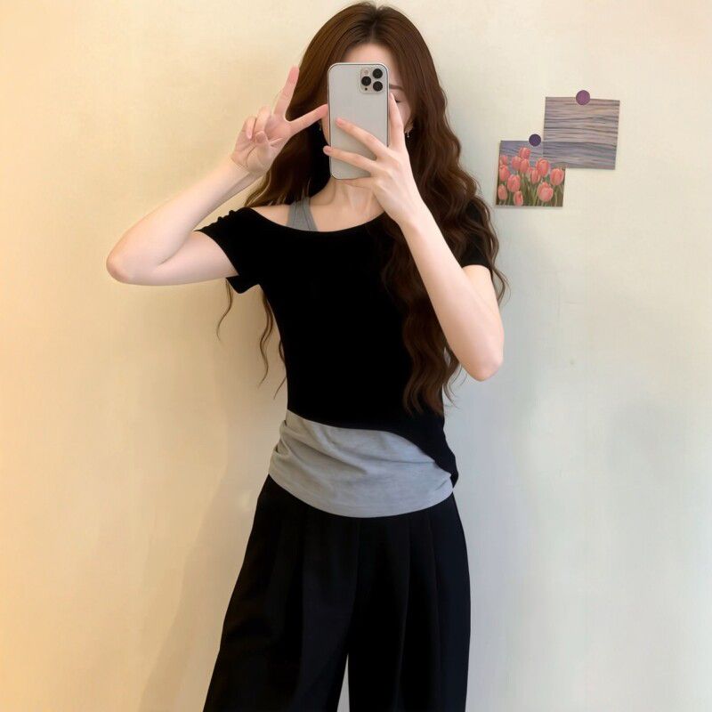 한 부서 페이크 레이어드 검정색 비스듬한 어깨 반팔 티셔츠 여성 여름 빅 사이즈 지방 mm 핫걸 배색 몸매 가꾸기 오프숄더 맨위