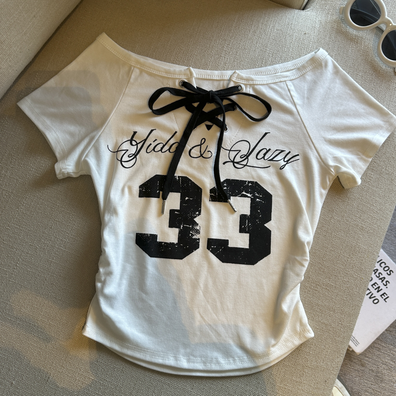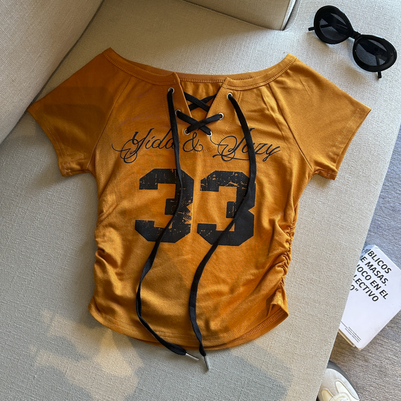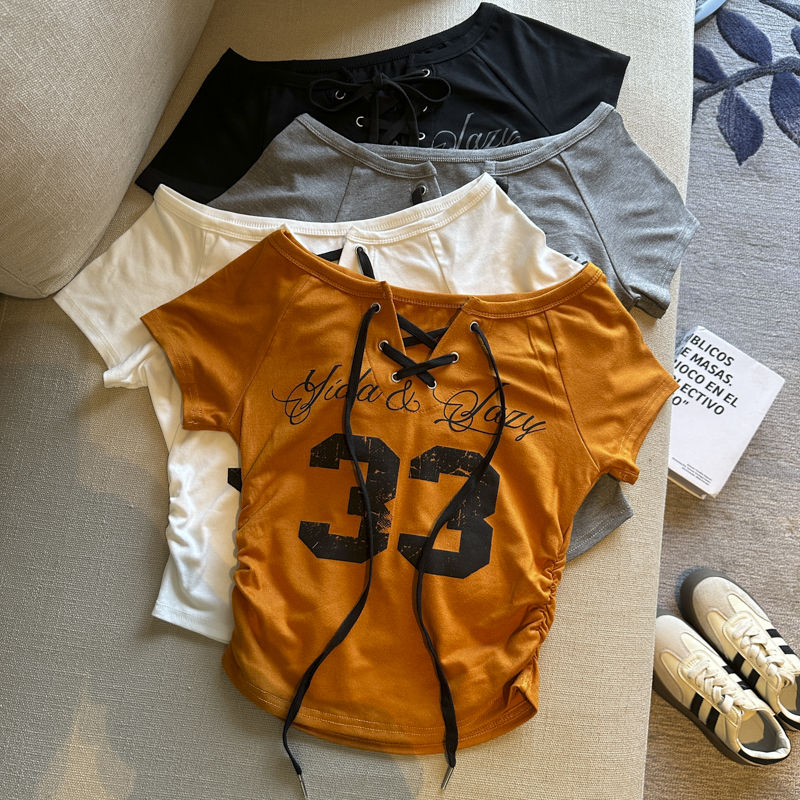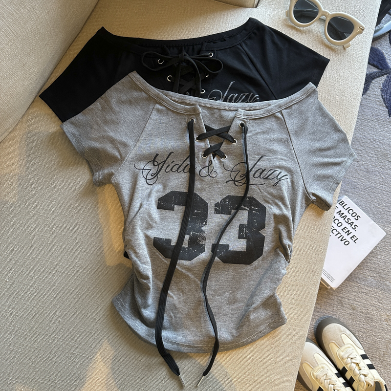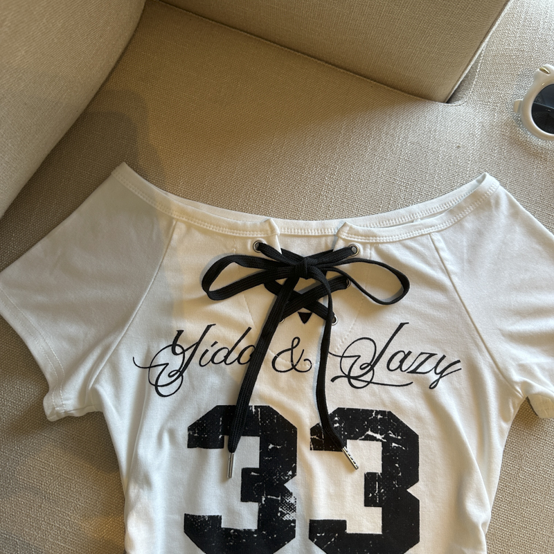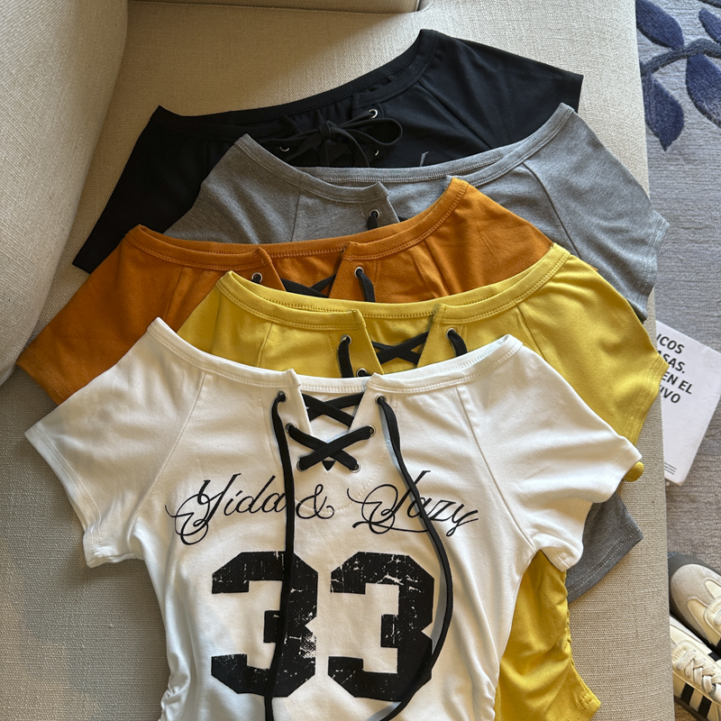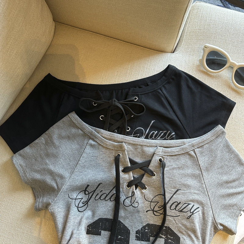실사 아메리칸 레트로 달콤한 차가운 바람 알파벳 프린트 레이스업 오프숄더 다용도 세련된 주름 반팔 티셔츠