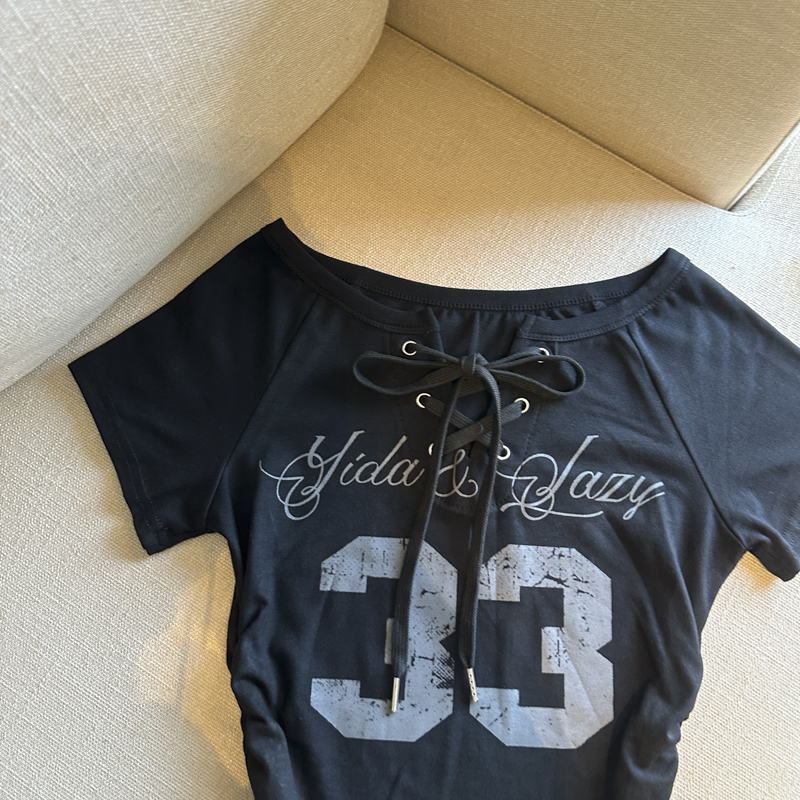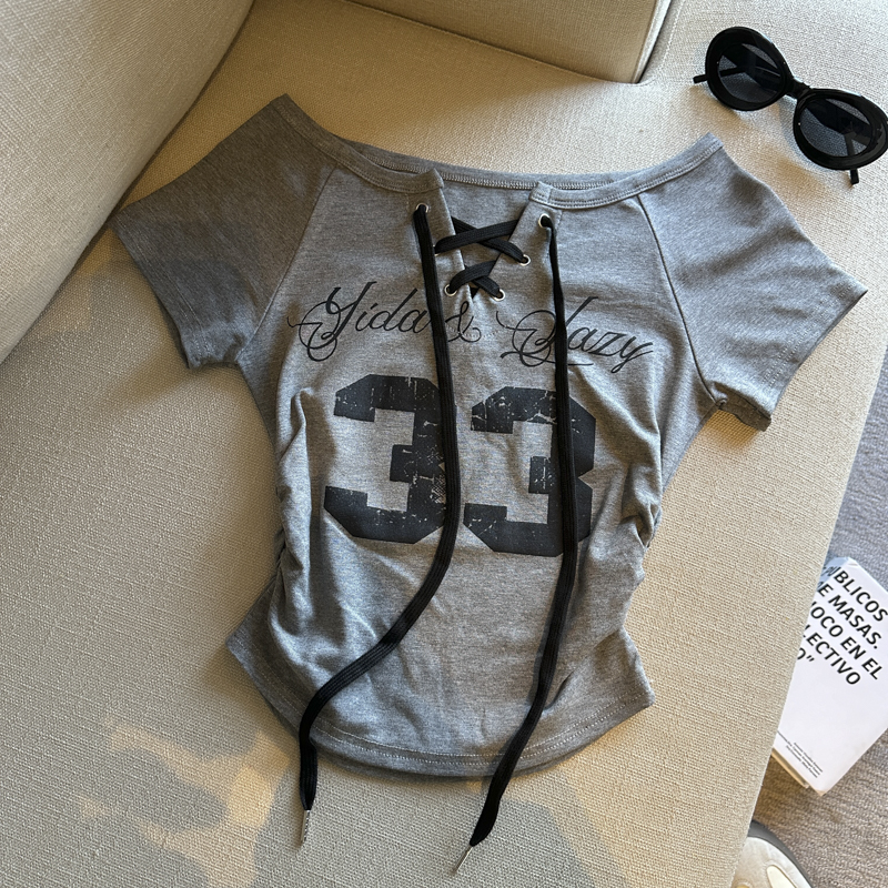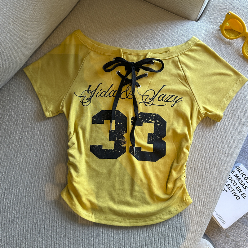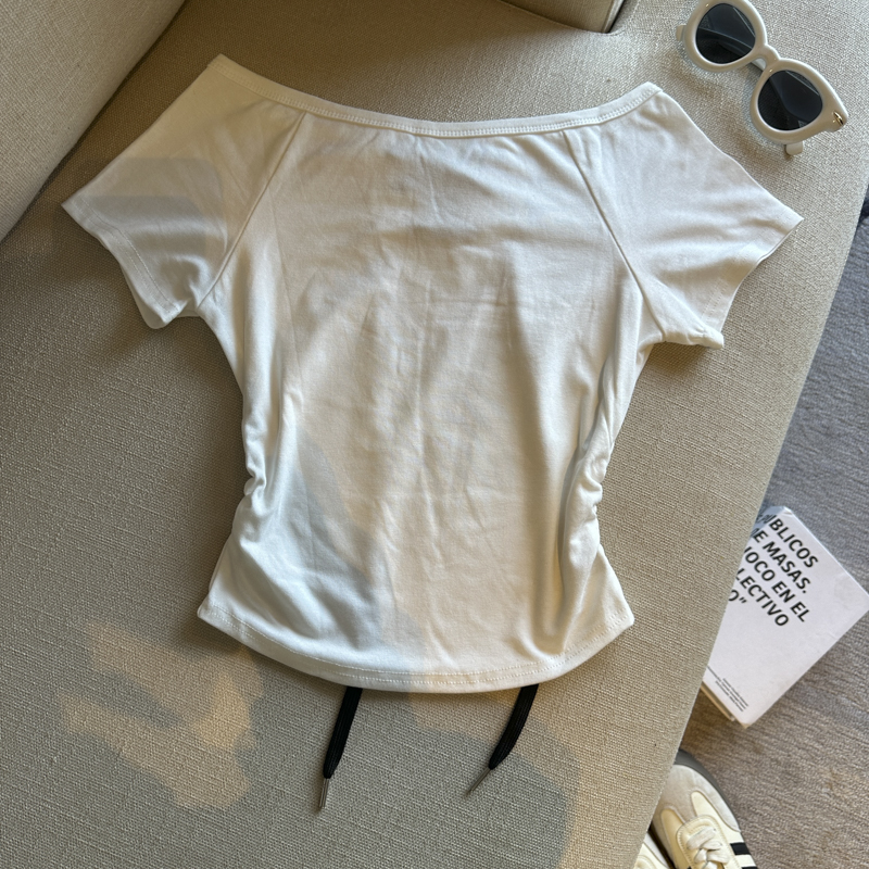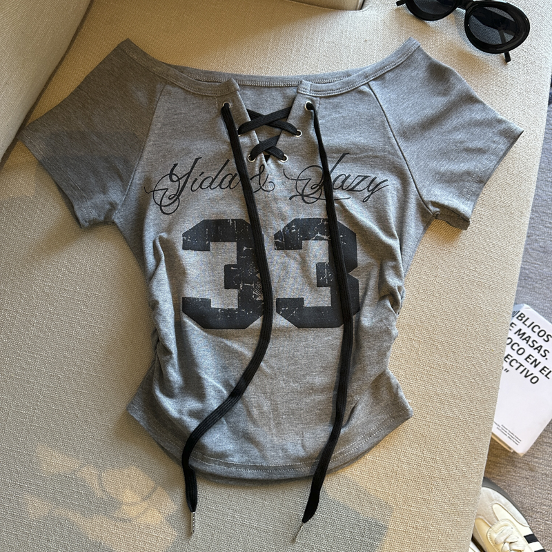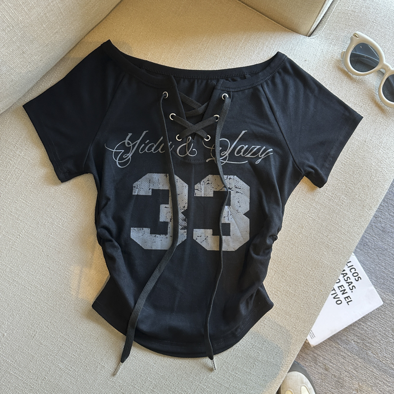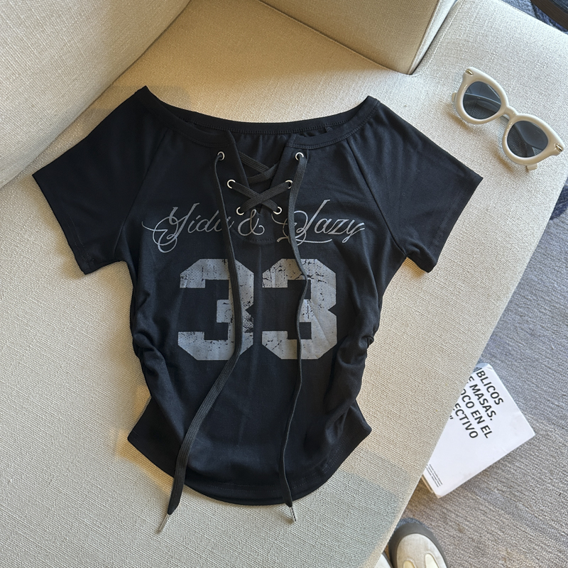 실사 아메리칸 레트로 달콤한 차가운 바람 알파벳 프린트 레이스업 오프숄더 다용도 세련된 주름 반팔 티셔츠
