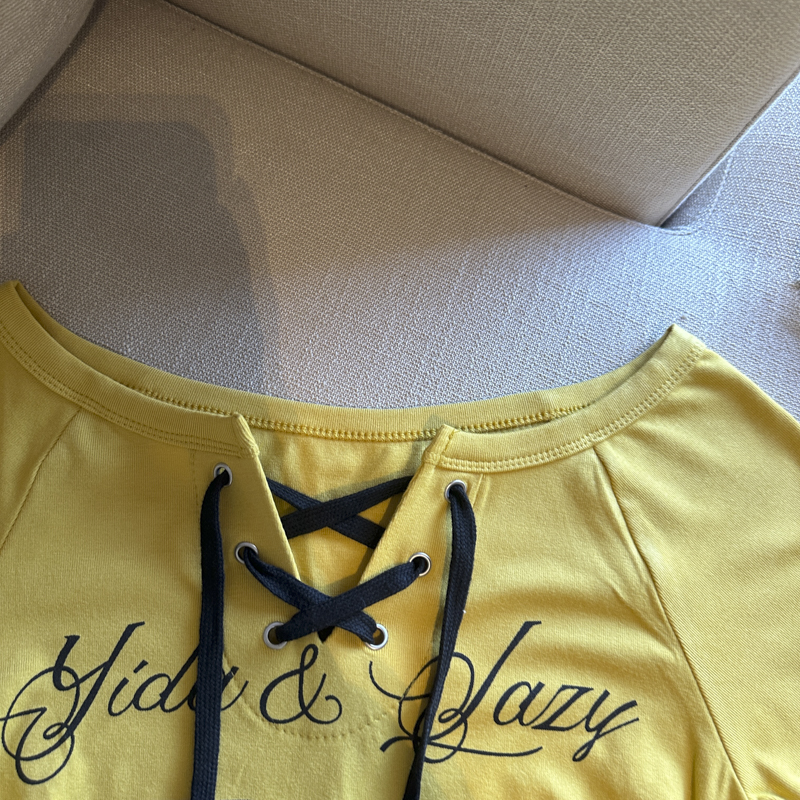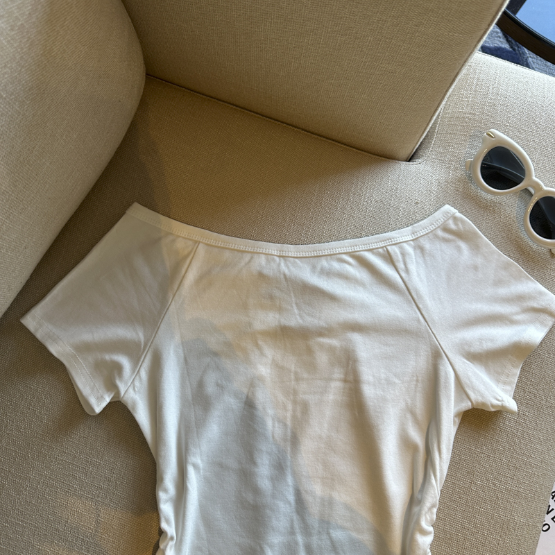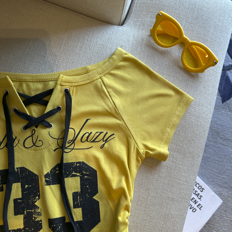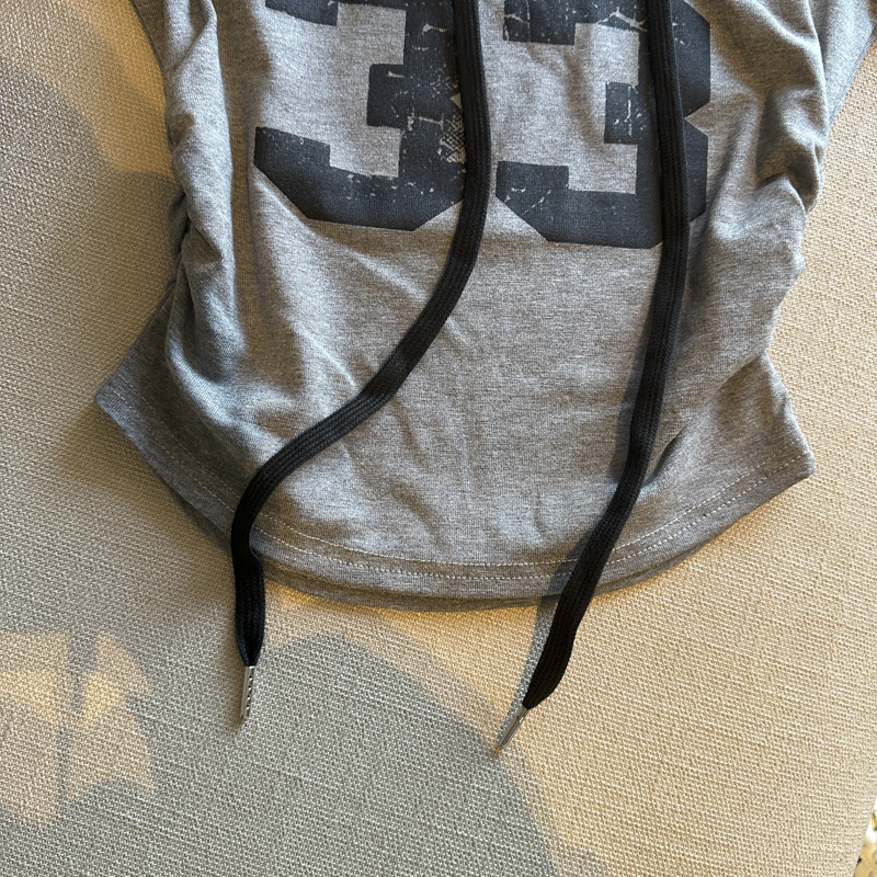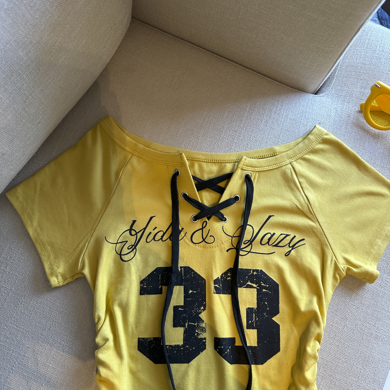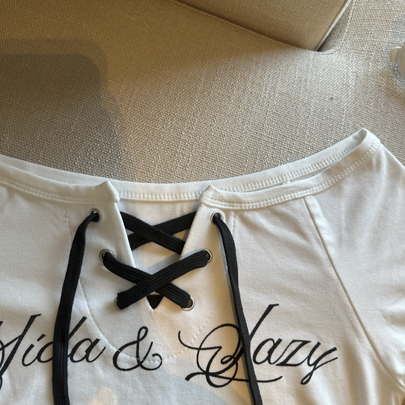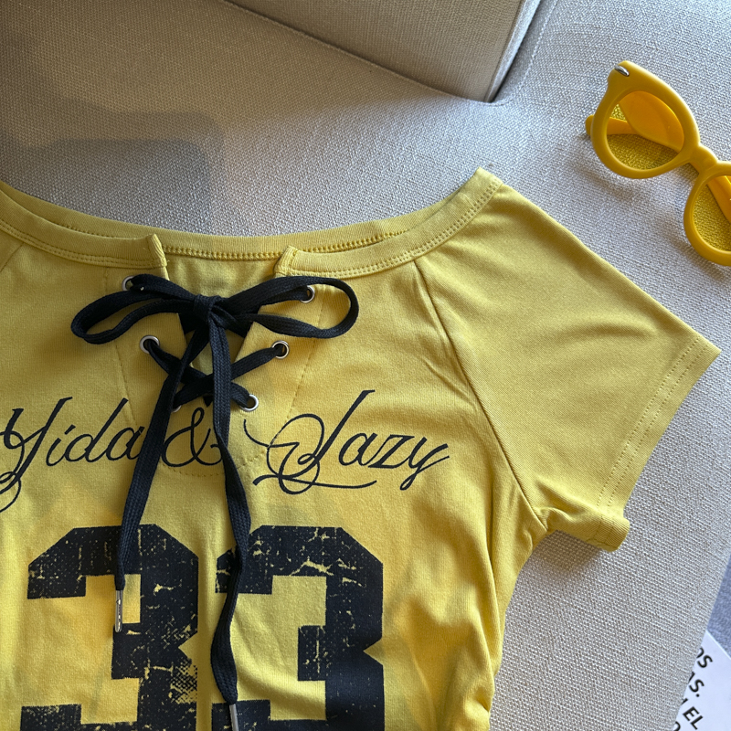 실사 아메리칸 레트로 달콤한 차가운 바람 알파벳 프린트 레이스업 오프숄더 다용도 세련된 주름 반팔 티셔츠