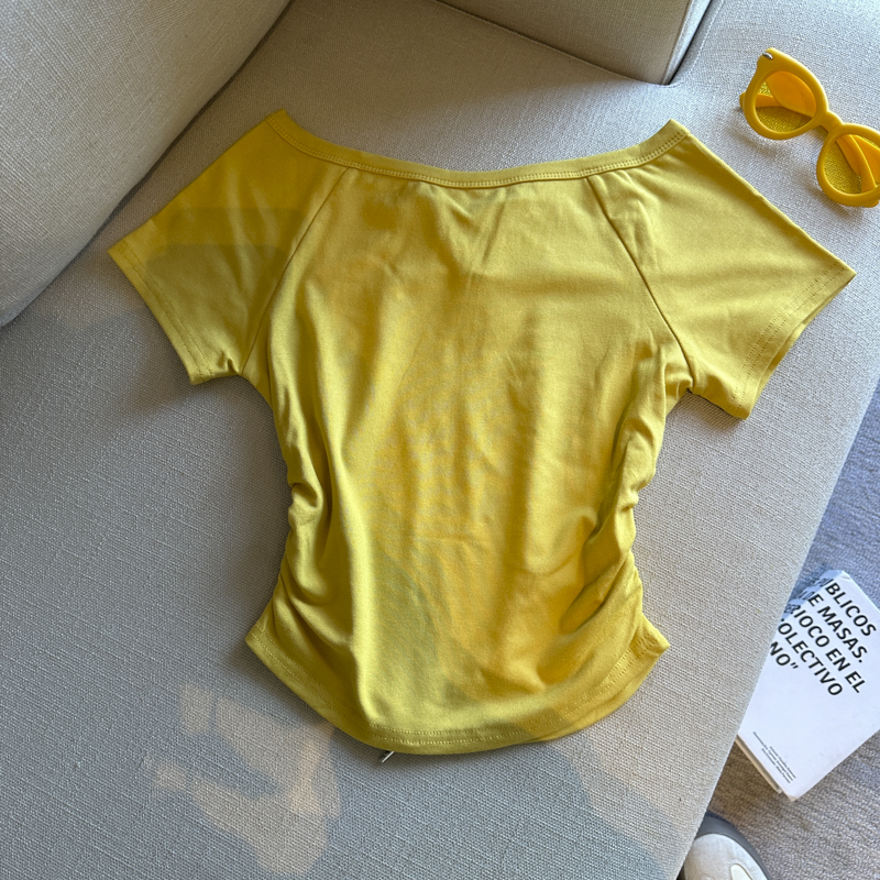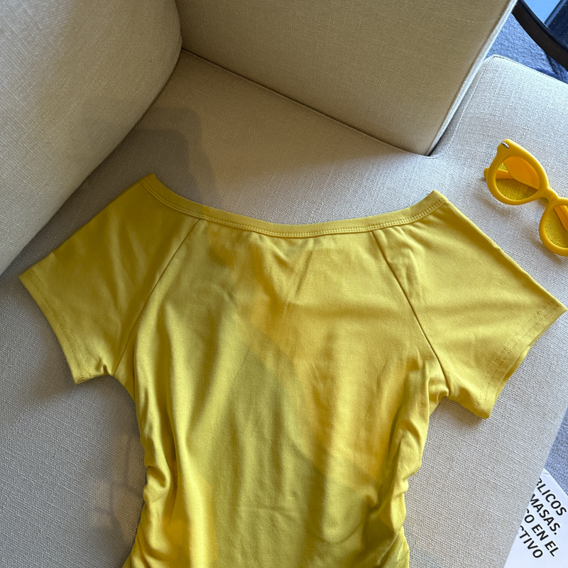실사 한 부서 심장 기계 순수한 욕망 바람 V넥 징 주름 신축성 슬림해 보이는 다용도 세련된 알파벳 반팔 티셔츠