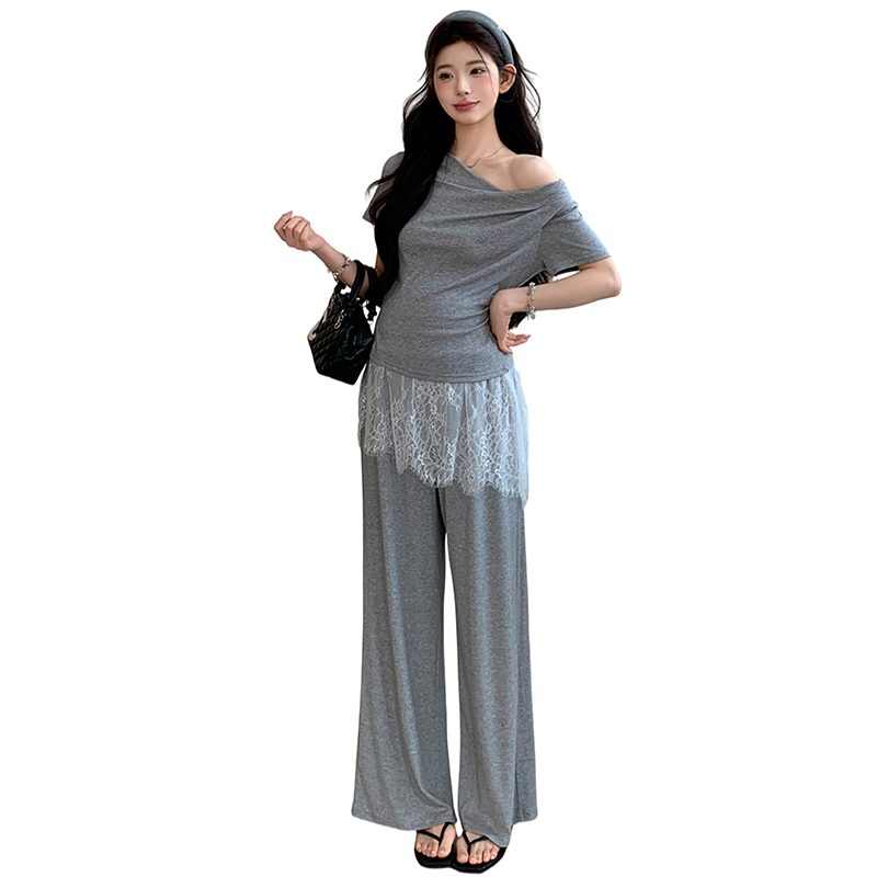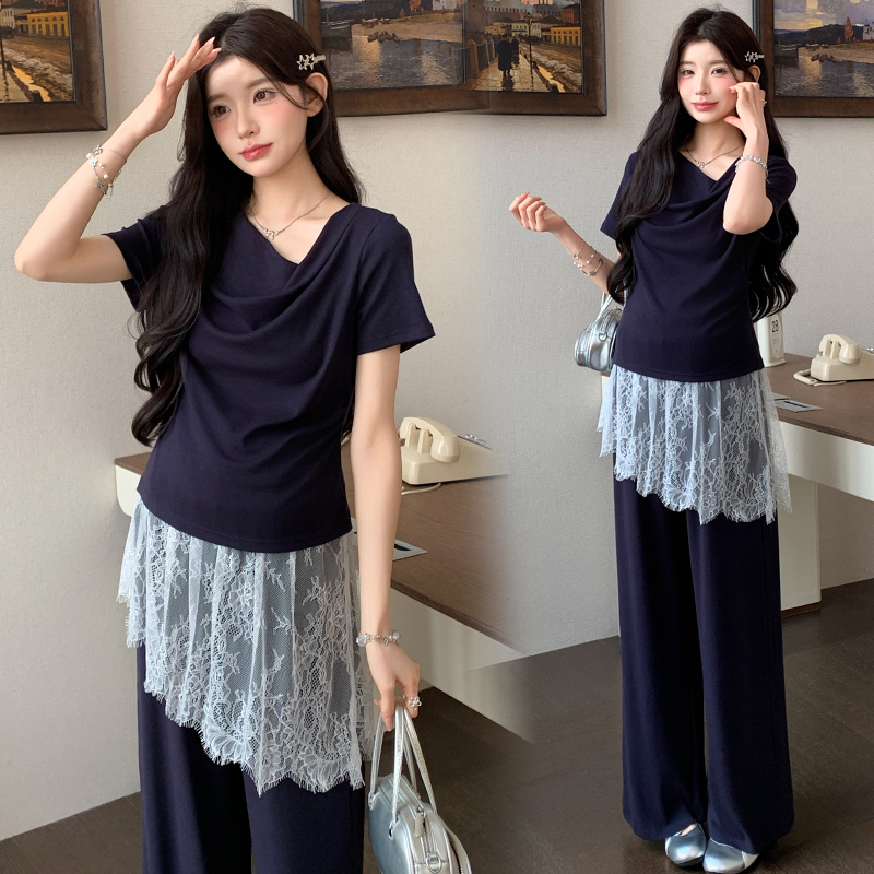 2026 여름 새로운 임산부 레이스 조각 방귀 커튼 티셔츠 와이드 레그 팬츠 느긋한 루즈핏 세트