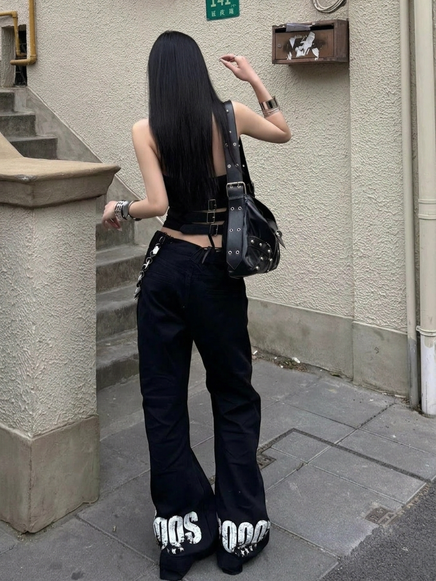 아시아 인 ~보다 y2k 핫걸 더블 용 프린트 청바지 여성 아메리칸 vintage 레트로 디스플레이 마이크로 나팔 루즈핏 긴 바지