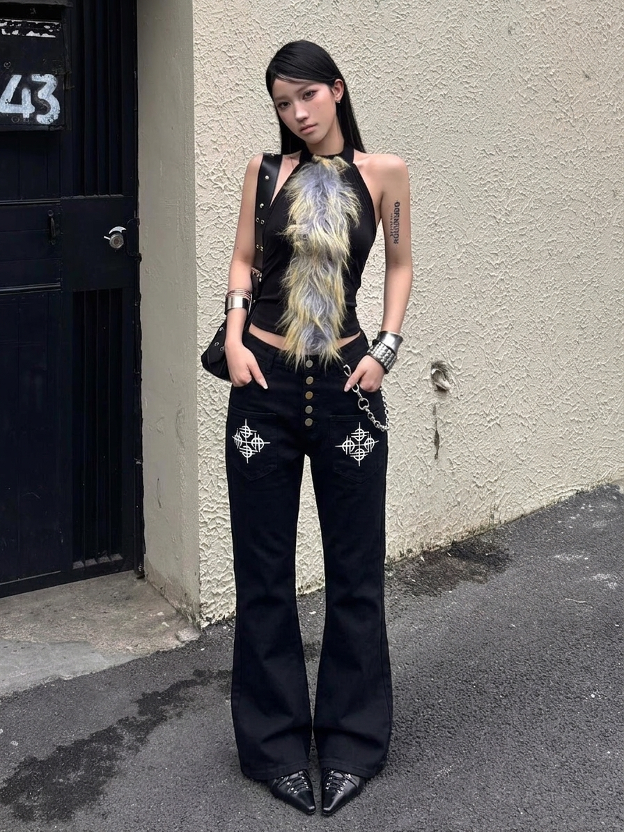y2k 아메리칸 검정색 마이크로 나팔 청바지 여자 하이웨이스트 슬림해 보이는 디자인 센스 작은 대중 타이트 바지 이문화