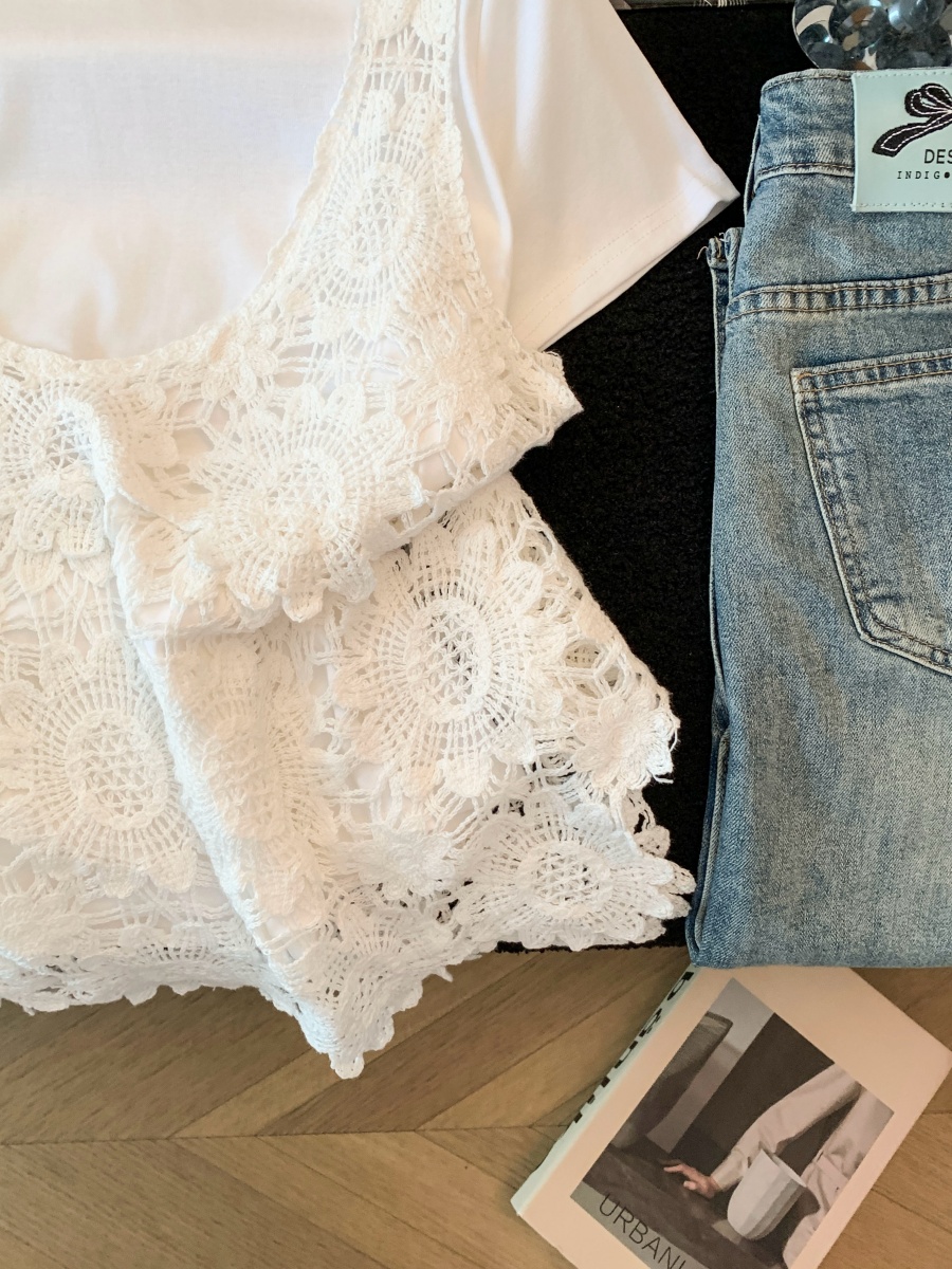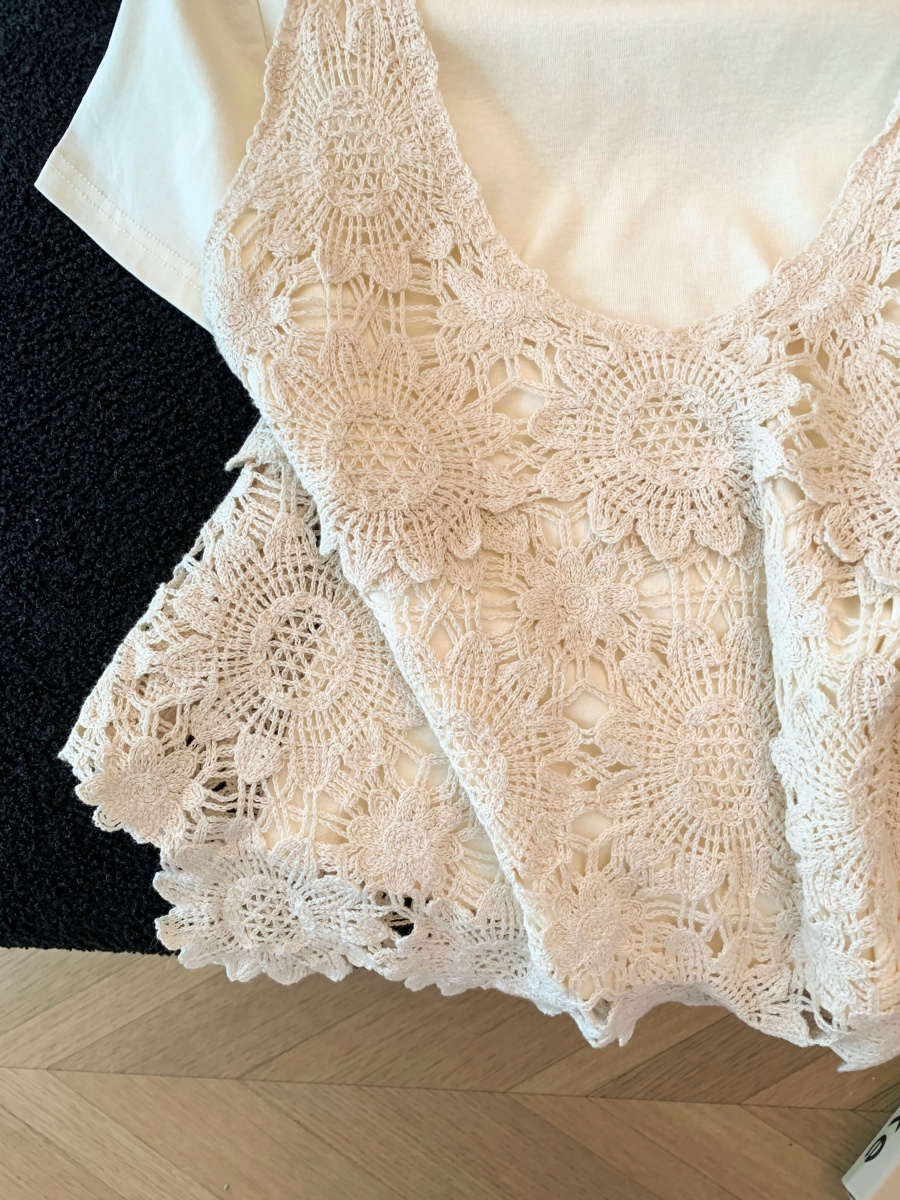 실사 프랑스식 홀로우 아웃 자수 술 V넥 니트 베스트 조끼 여성 여름 외국 가스 스택 착용 중 반팔 맨위