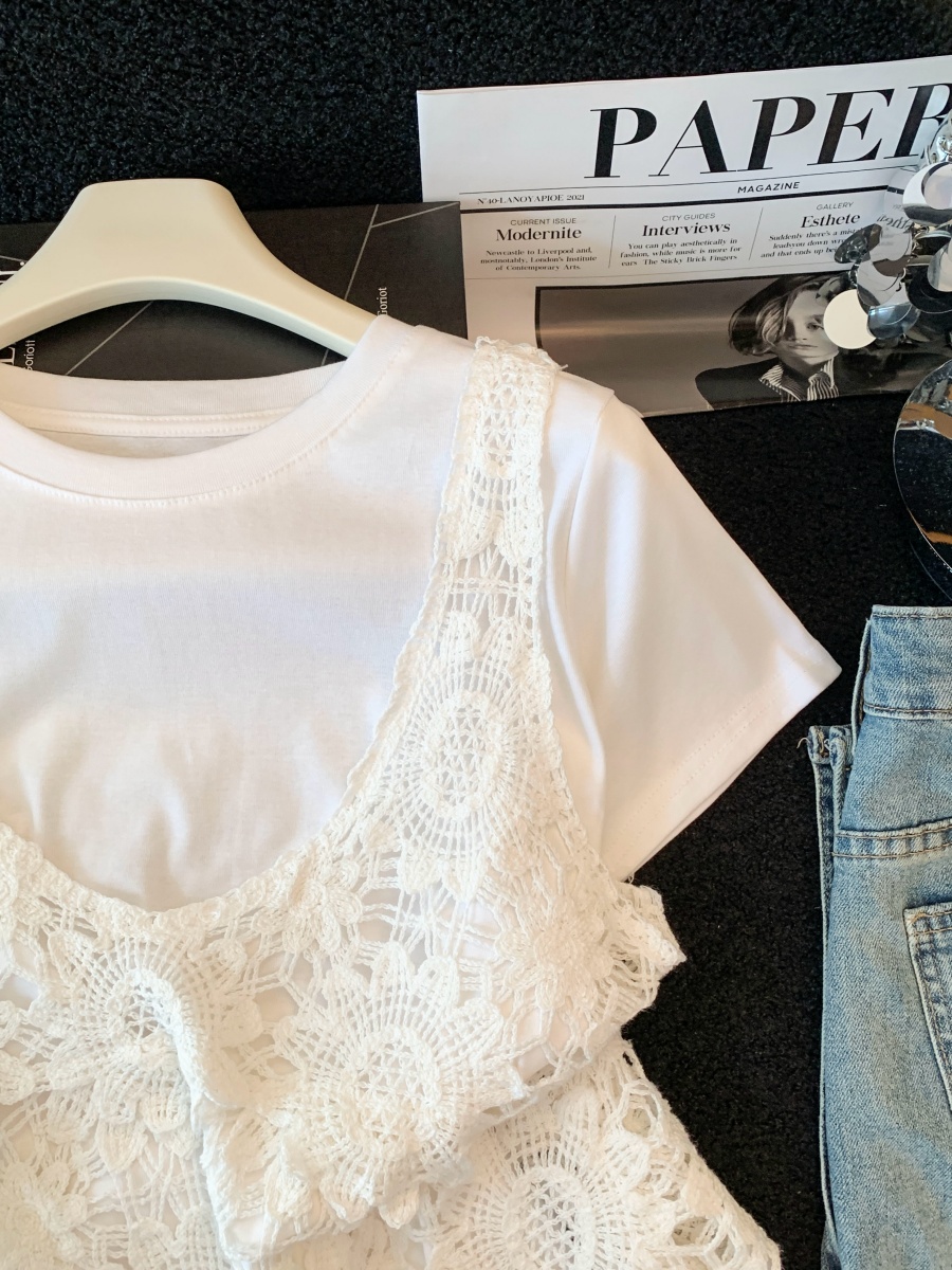 실사 여름 새로운 자수 홀로우 아웃 무거운 작업 구슬 조각 자수 레이스 베스트 다용도 반팔 티셔츠 투피스 슈트