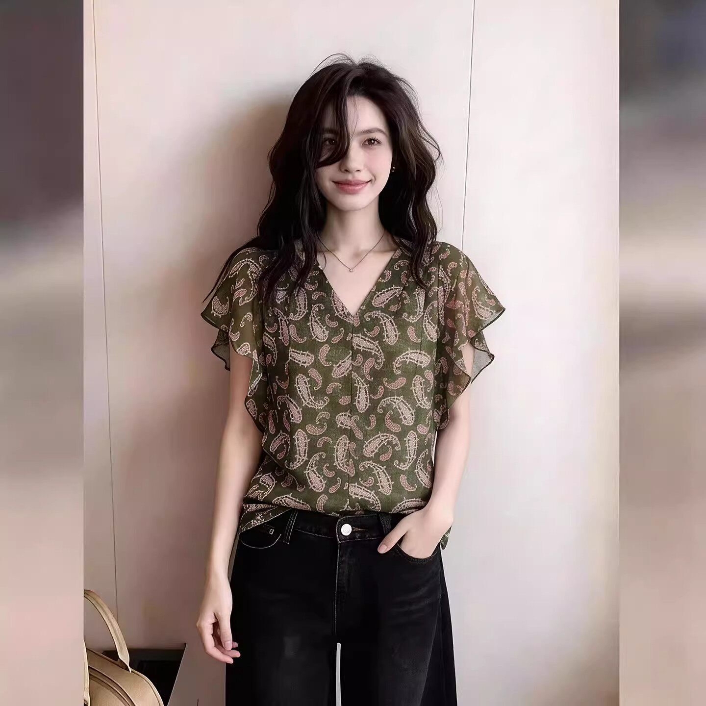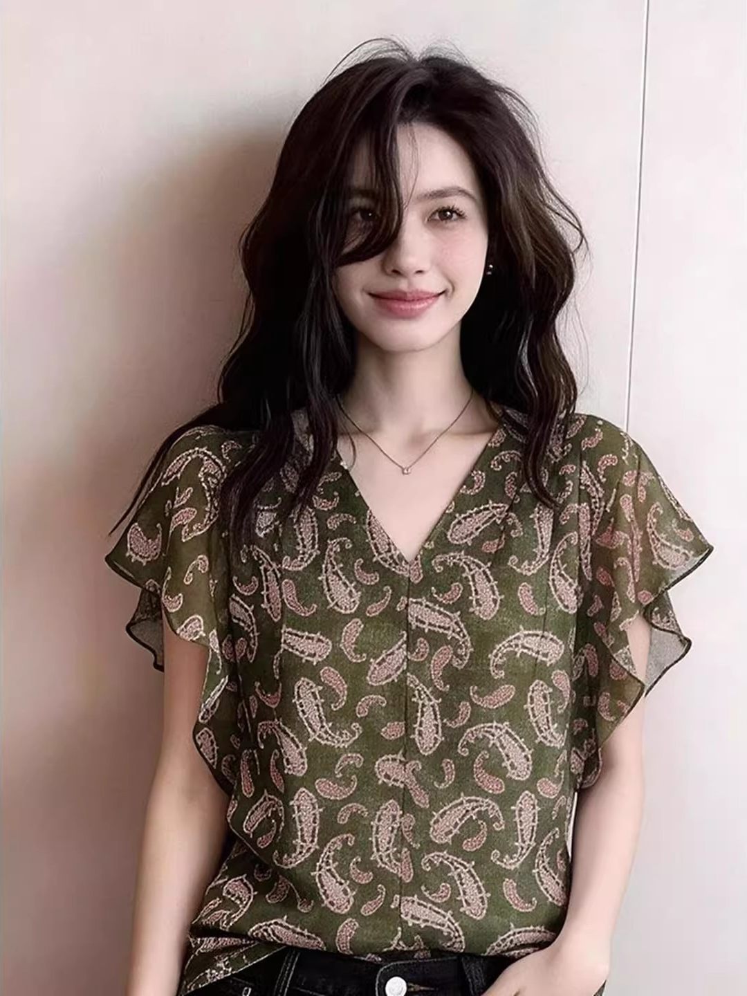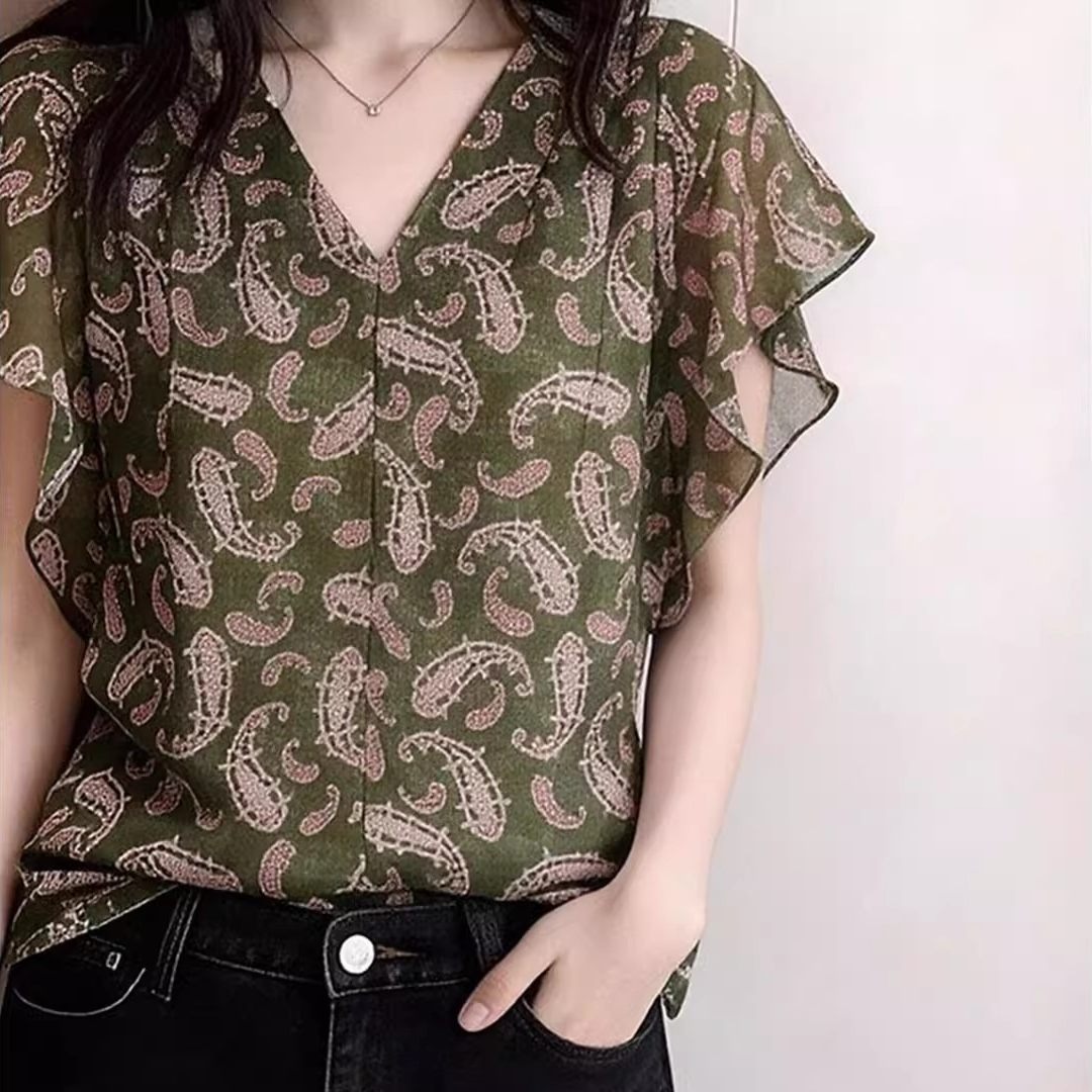 여름 새로운 고급 보헤미안 바람 V넥 프린트 맨위 여성 녹색 한 마디 소매 슬림해 보이는 캐주얼 빅 사이즈 인사이드 가져 가라.