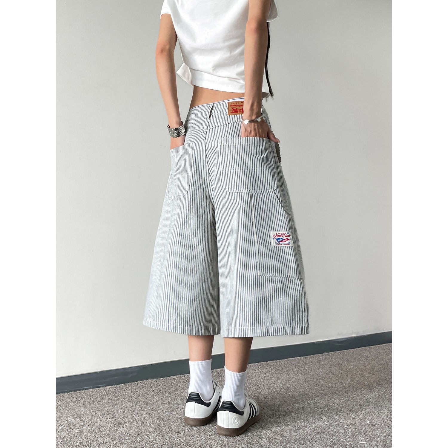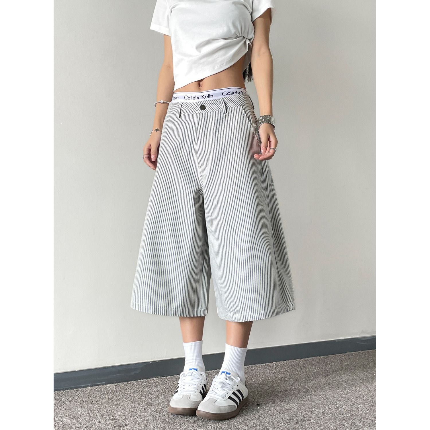 아메리칸 레트로 핀 스트라이프 7부 바지 여성 작은 대중 디자인 센스 넓은 다리 캐주얼 반바지 ins 트렌디