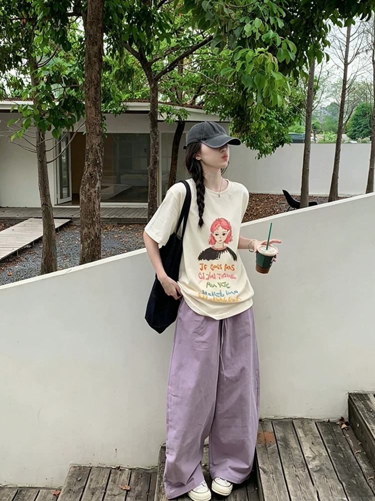 경관 그림 21 순면 210 그램 여름 드레스 한 부서 반팔 티셔츠 여성 한국 스타일 루즈핏 빅 사이즈 프린트