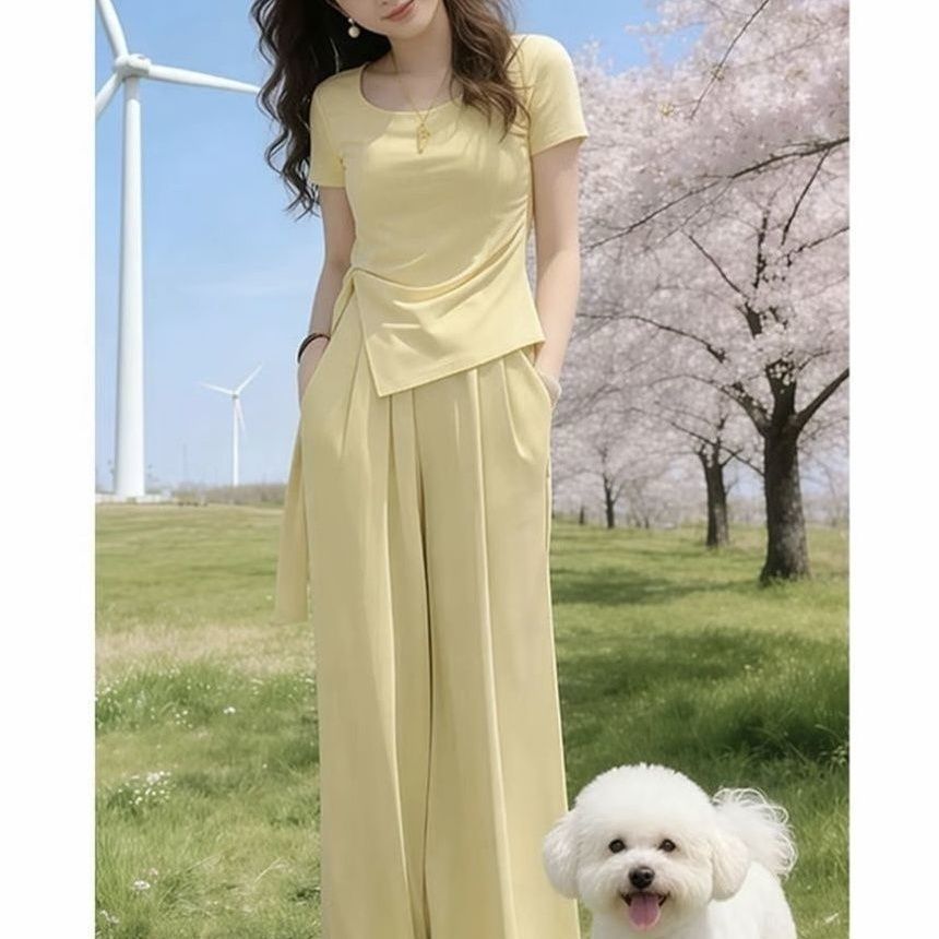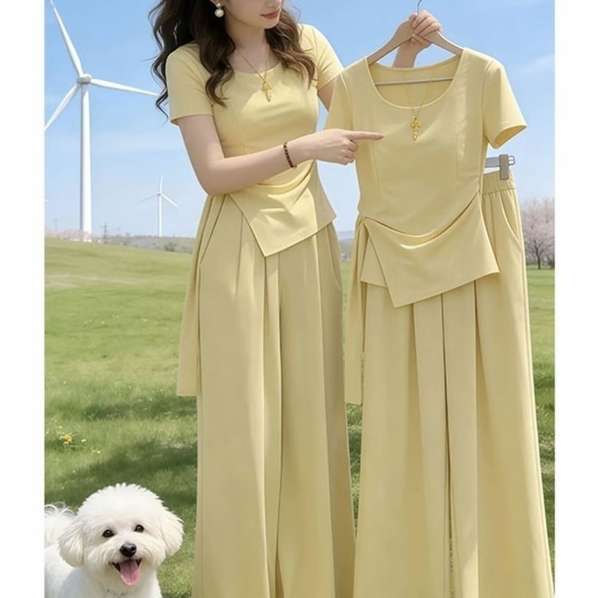 패션 캐주얼 세트 여성 2026 여름 새로운 몸매 가꾸기 불규칙 스트랩 맨위 티셔츠 와이드 레그 팬츠