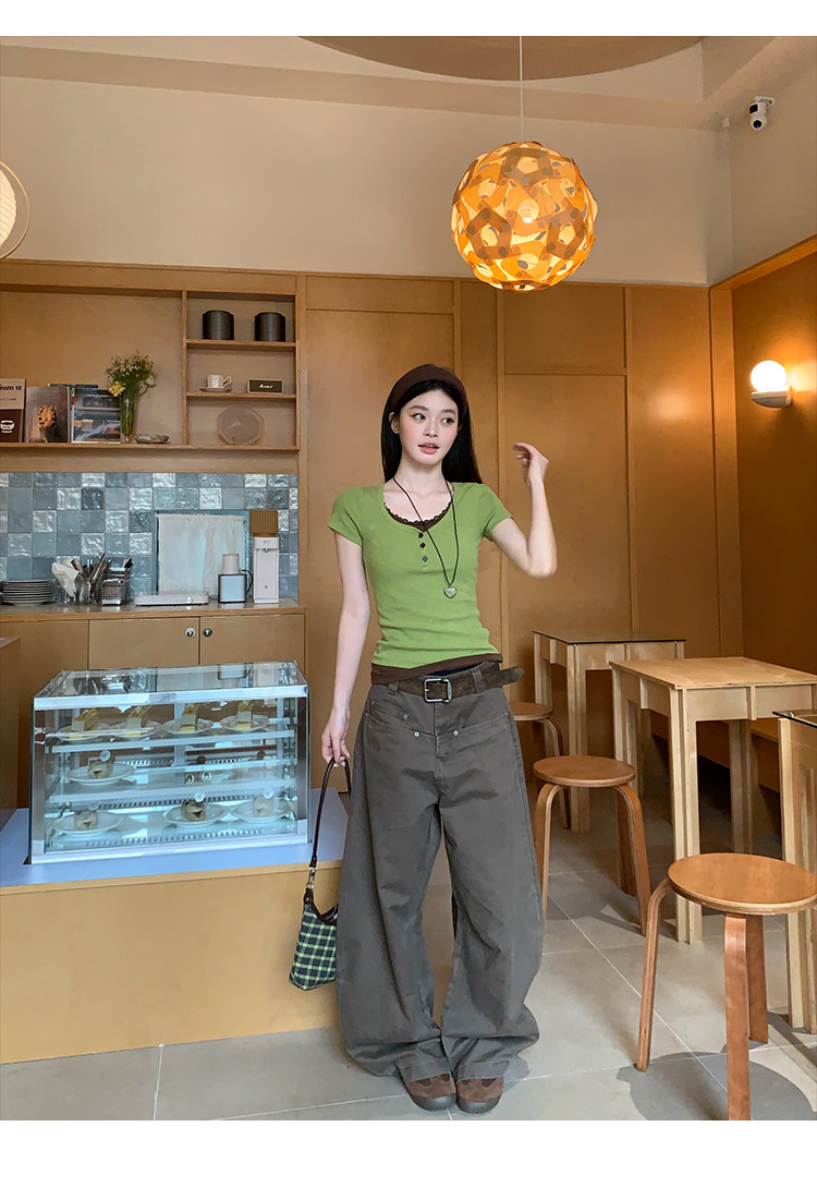 송 긍정적 인 En 녹색 페이크 레이어드 패치워크 긍정적 인 어깨 반팔 티셔츠 여성 여름 몸매 가꾸기 한 부서 아름다운 고유 한 작은 맨위