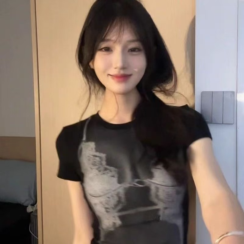 검정색 그라데이션 장미 프린트 라운드 넥 쇼트 스타일 이슬 허리 몸매 가꾸기 슬림해 보이는 반팔 티셔츠 여자
